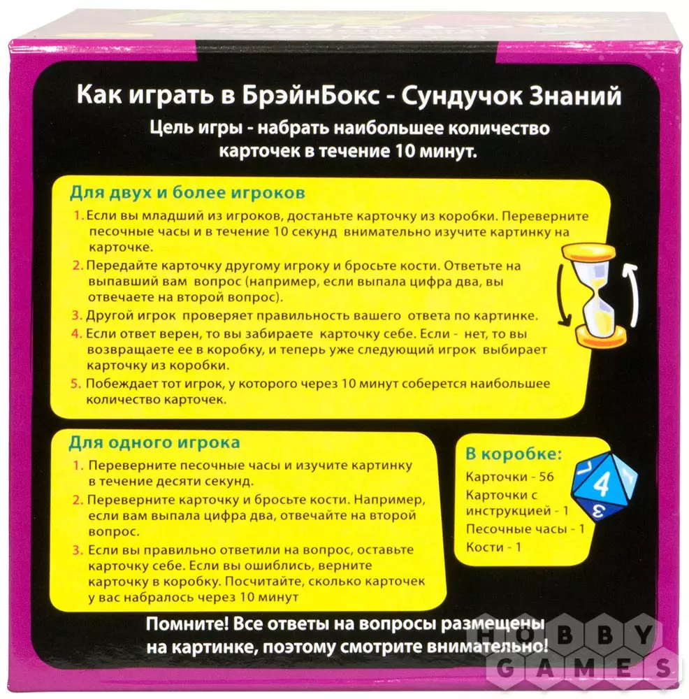 Серия настольных игр "Сундучок знаний" рассчитана на обучение детей в весёлой игровой форме. Эти игры развивают внимательность и наблюдательность, предлагая участникам внимательно изучить картинку в течение десяти секунд, а потом ответить на определённый вопрос. Каждая коробочка с игрой содержит несколько десятков карточек, объединённых одной тематикой. Таким образом, ребёнок, изучая карточки, усваивает полезную информацию по тому или иному предмету и узнаёт много нового и интересного.