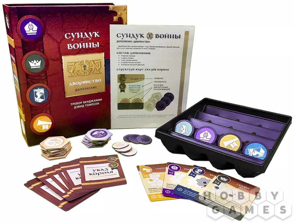 Дополнение "Дворянство" добавляет в настольную стратегию "Сундук войны" новые отряды и механики: теперь вы можете отправлять в бой элитные отряды дворян, а также пресекать смуту в их рядах при помощи королевских указов и увещеваний епископов. Дополнение отлично сочетается не только с базовой игрой, но и со вторым дополнением – "Осада".
