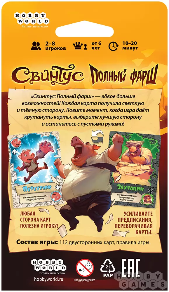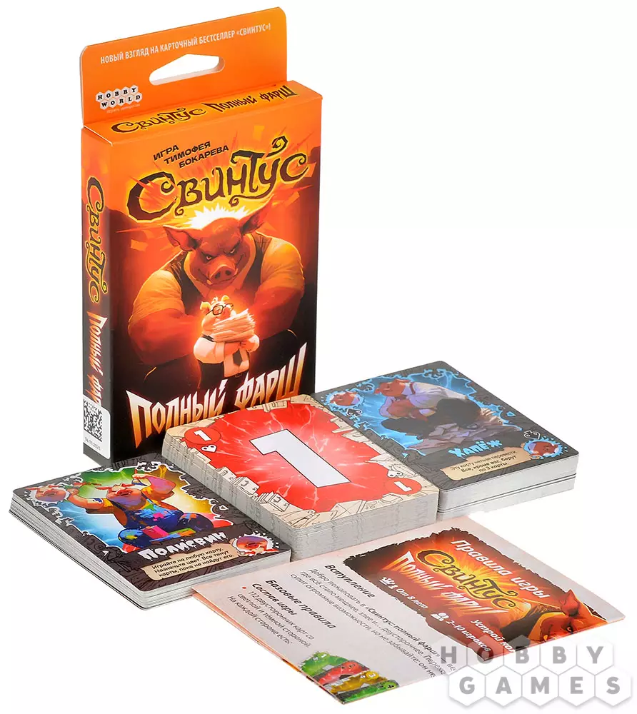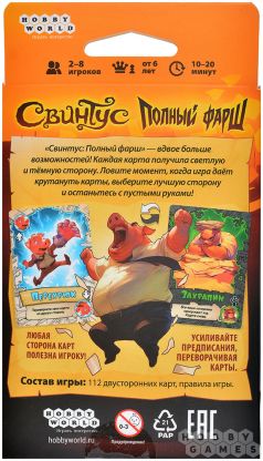 "Свинтус: Полный фарш" сохраняет дух оригинала, но добавляют крутой вираж: нужно быстрее всех избавиться от карт, используя их двойную природу. Ваша стратегия будет заключаться в том, чтобы чувствовать момент, когда переворот карты принесёт максимальный эффект и оставит соперников в растерянности.