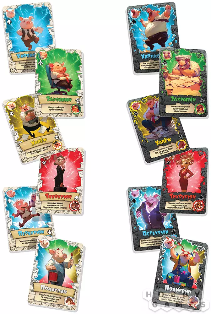 В мире свинов наступил настоящий переполох! Колода карт обрела двойную жизнь, и теперь каждый игрок в любой момент может перевернуть игру вместе с картами. То, что казалось верной победой, оборачивается весёлым разгромом, а коварные планы соперников рассыпаются благодаря ловкому движению вашей руки.