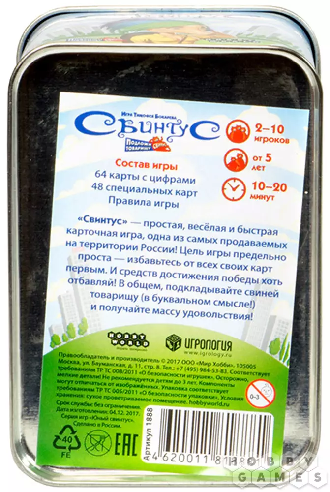 Яузина14.01.2021 20:53Очень любим играть в Свинтус, игра понятная для детей и самое главное интересная для взрослых! т.к. играть в обычные бродилки-ходилки с детьми скучно. А в Свинтус и взрослым весело)) удобная коробка для хранения игры. Отлично подойдет на подарок.