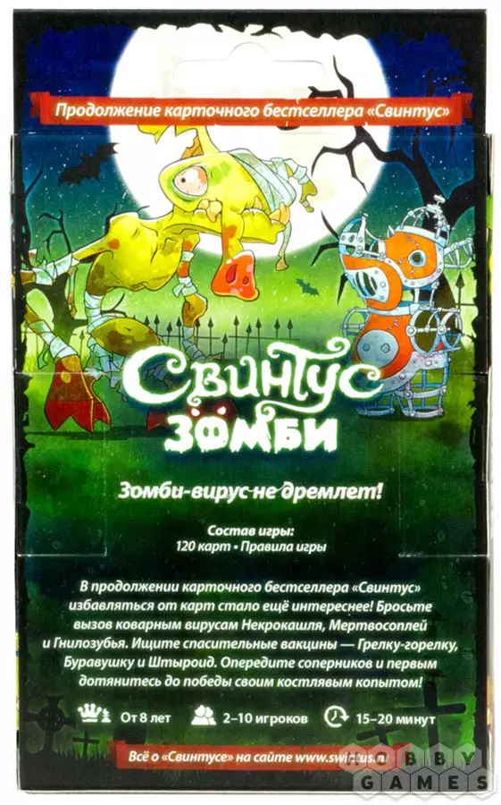 «Свинтус Зомби» – это очередная игра в мегапопулярной серии карточных игр «Свинтус» для тех, кто пытается выжить в офисе. Теперь избавиться от всех карт на руке стало ещё сложнее — и ещё интереснее! Заражайте соперников зомби-вирусами, ищите спасительные вакцины и станьте первым, кто дотянется до победы своим костлявым копытом!