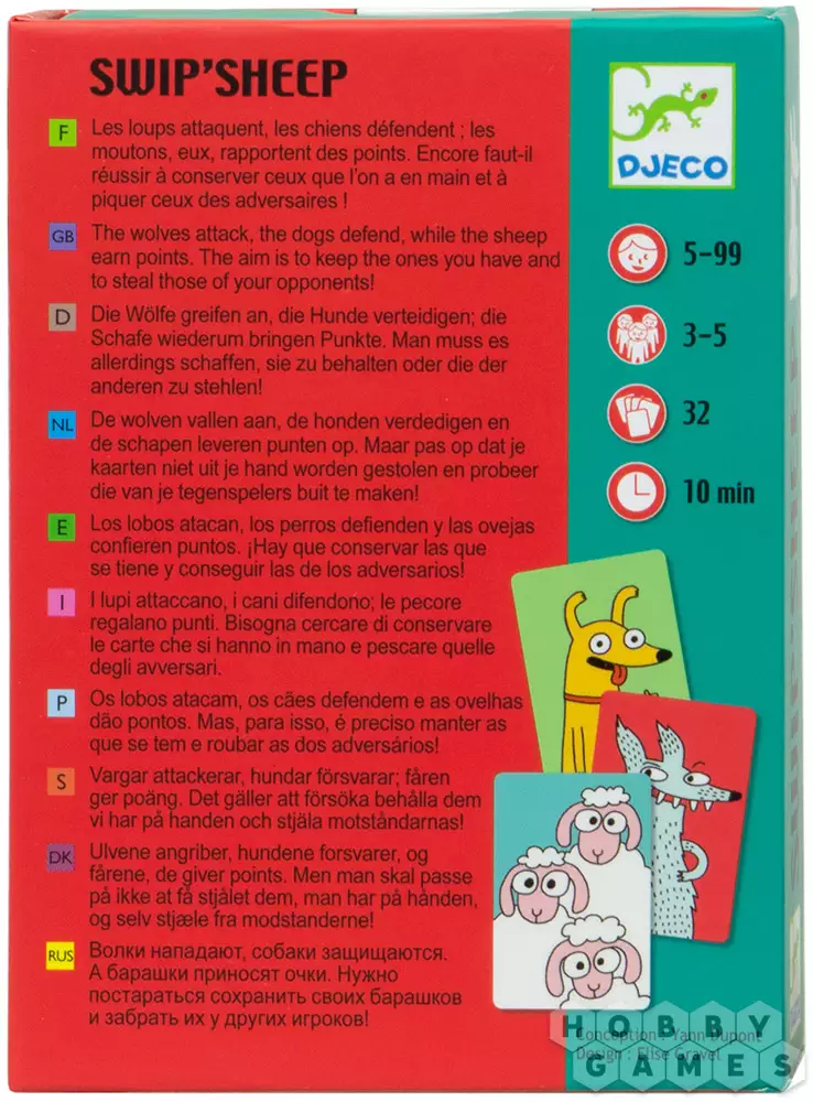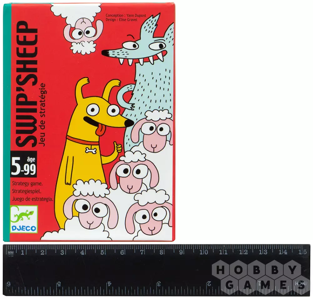 Swip'Sheep – весёлая настольная игра для детей от 5 лет. Игровой комплект содержит 32 карточки с яркими иллюстрациями с волками, собаками, барашками. Перед игрой участники получают на руки по 3 карты. В процессе нужно атаковать карточками волков других игроков, защищаться при помощи собак, хранить своих овец и пытаться заполучить овец других игроков. Игровая партия состоит из раундов, число которых равно числу участников. По окончанию всех раундов, игроки подсчитывают количество барашков на своих картах. У кого больше овец – тот победил!
