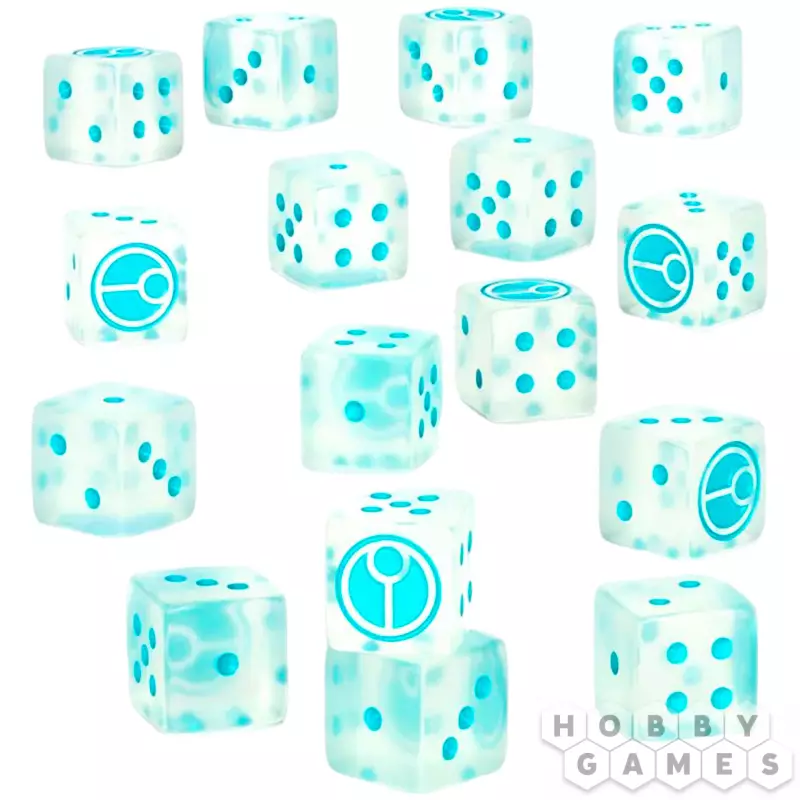 Комплект включает 16 кубиков размером 16х16 мм. Они прозрачные, а символы, включая знак Касты Огня (Fire Caste) на грани с шестёркой, окрашены бирюзовым.