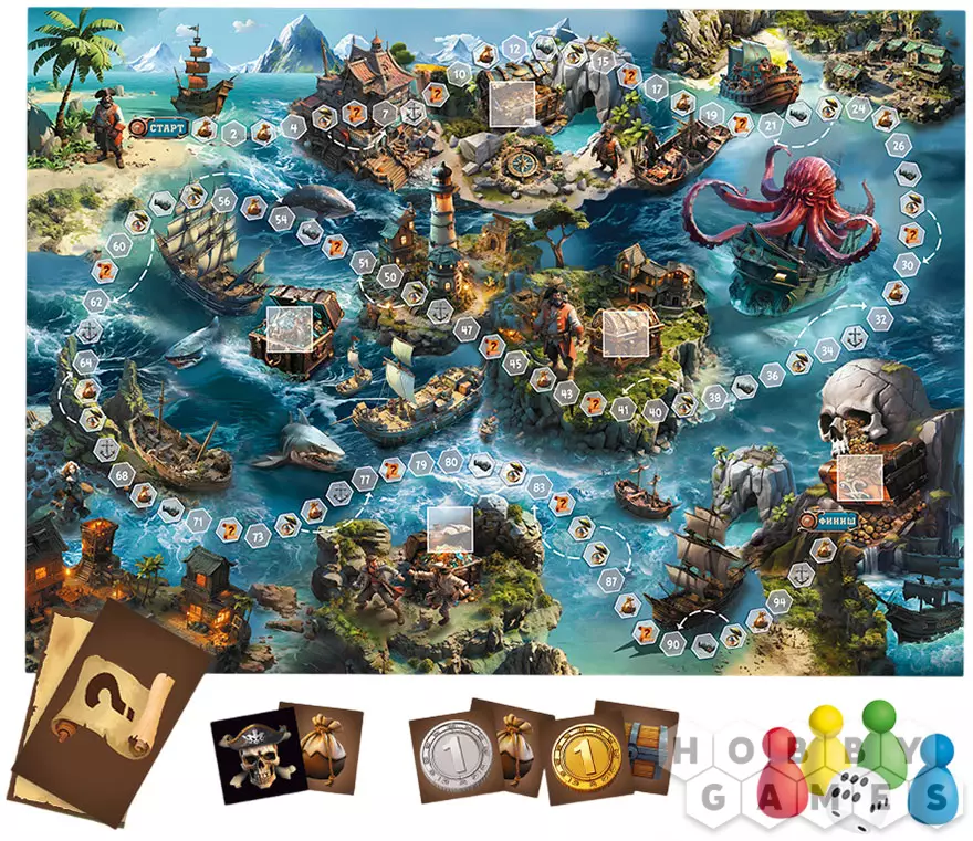В этой игре вы отправитесь в пиратское путешествие по островам, полным загадок и тайн. Бросайте кубик, двигайтесь по карте, выполняйте задания с карточек и собирайте монеты, стараясь не угодить в ловушки. А если путь приведёт вас к другому игроку – приготовьтесь к настоящему абордажу! Только удача и решимость определят, кто станет капитаном, а кто отправится за борт.