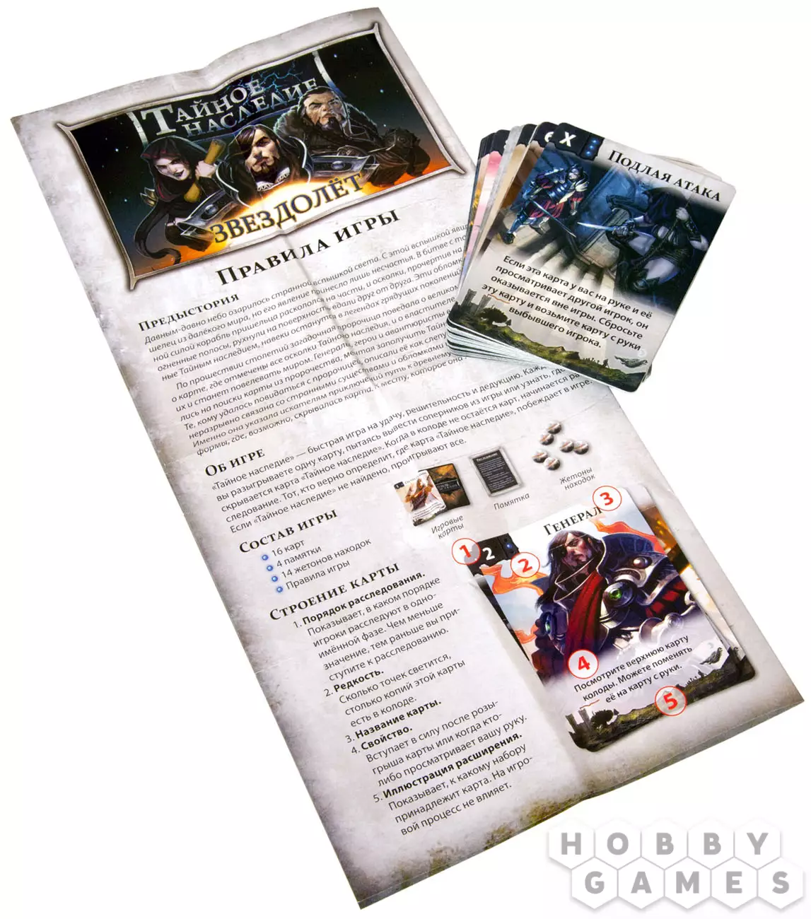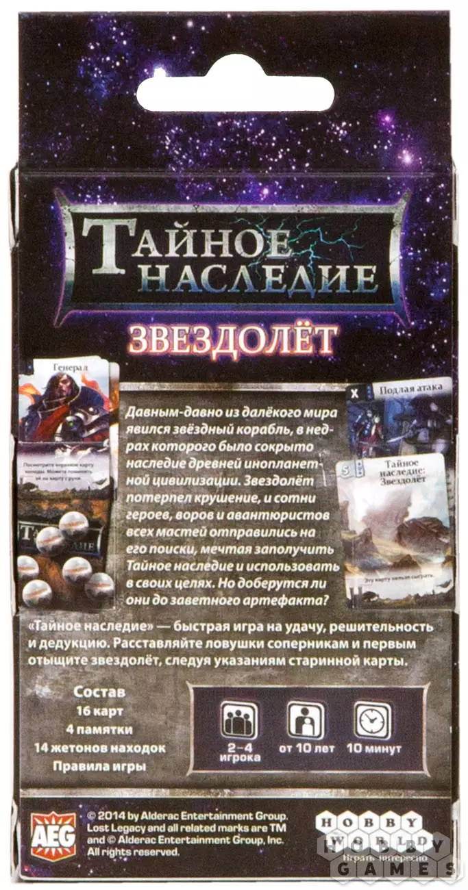 "Тайное наследие. Звездолёт" – настольная игра на удачу, решительность и дедукцию. Ваша задача – отправиться на поиски карты, которая, согласно легенде, приведёт Вас к великому могуществу. Главное – найти карту первыми...
