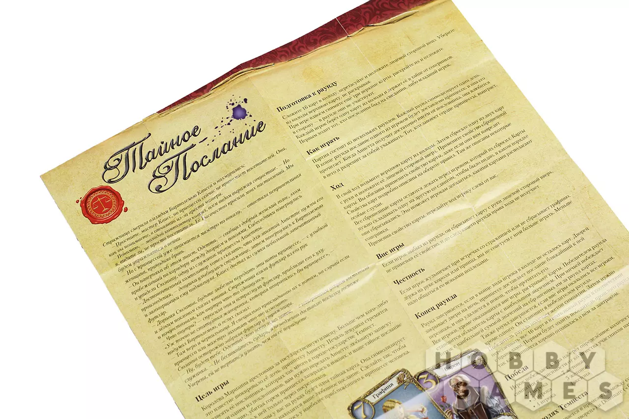 "Тайное послание" – это быстрая и компактная игра, которая не оставит никого равнодушным. Её простые правила и незамысловатый игровой процесс тесно переплетатся с любовной интригой и придворными сплетнями.