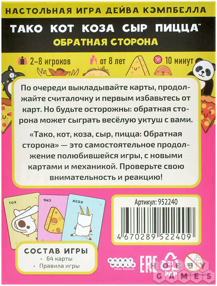 И также стоит упомянуть, что это самостоятельная игра, но можно смешать её с базовой версией "Тако кота", чтобы увеличить продолжительность партии, количество игроков, веселья и забавной неразберихи.