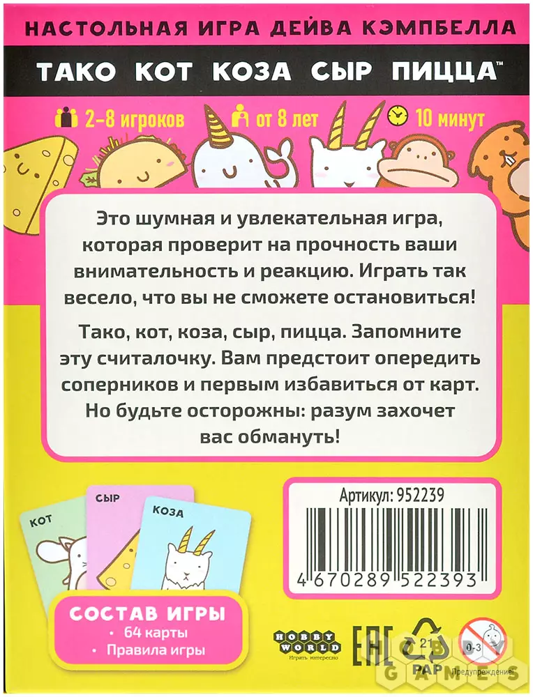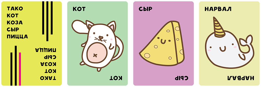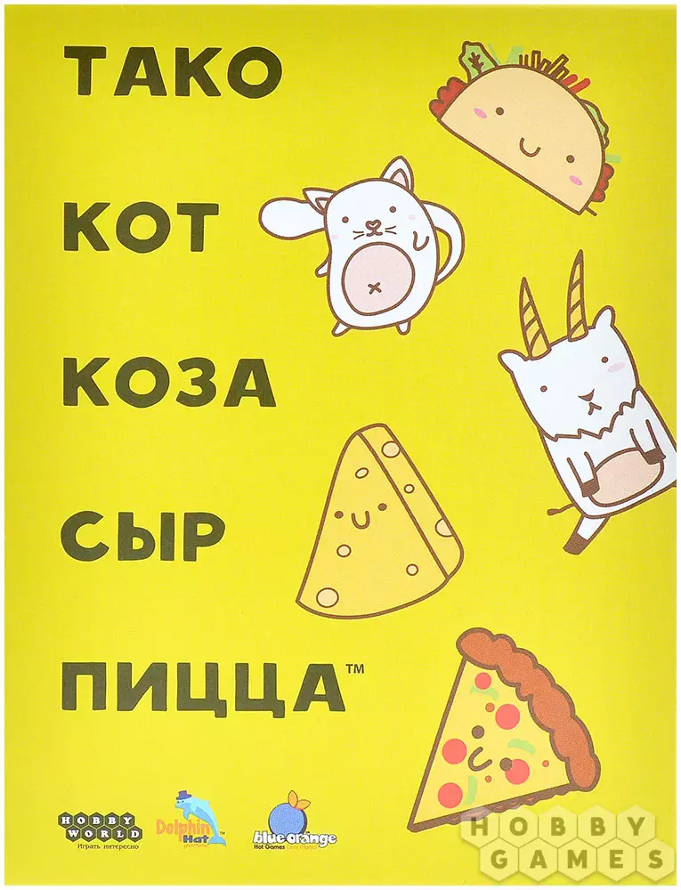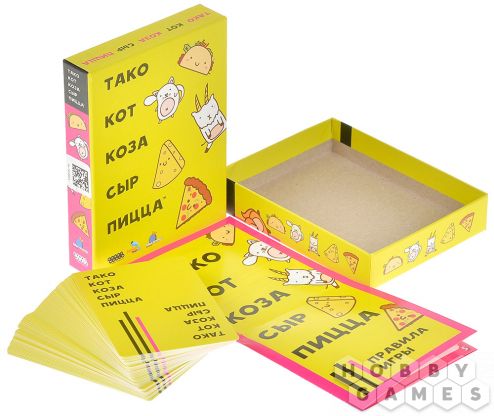 В этой игре вам придется выкладывать на стол карты, произнося вслух слова "тако, кот, коза, сыр, пицца", вне зависимости от того, что будет изображено и написано на картах. А также нужно будет делать определенные действия, если в игре появились особые карты: горилла, сурок или нарвал.