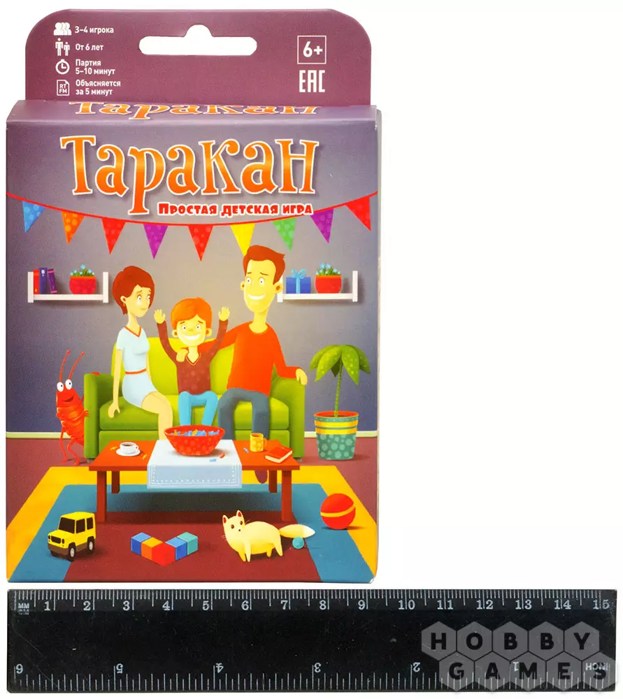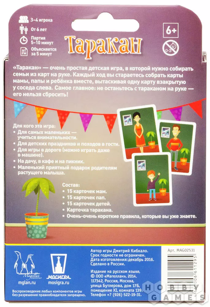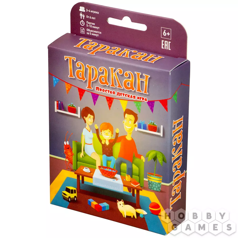 "Таракан" – это донельзя простая настольная игра для детей и их родителей. Игра состоит из раундов, в ходе которых игрок слева будет вытягивать карту у вас из руки, а вы будете вытягивать карту у игрока справа. Этот процесс происходит в закрытую, и никто не знает, какие карты находятся в руках у участников. Цель игры – собрать полную семью из папы, мамы и ребёнка. Главным подвохом игры является карта таракана, её нельзя сбросить и она приводит к поражению.