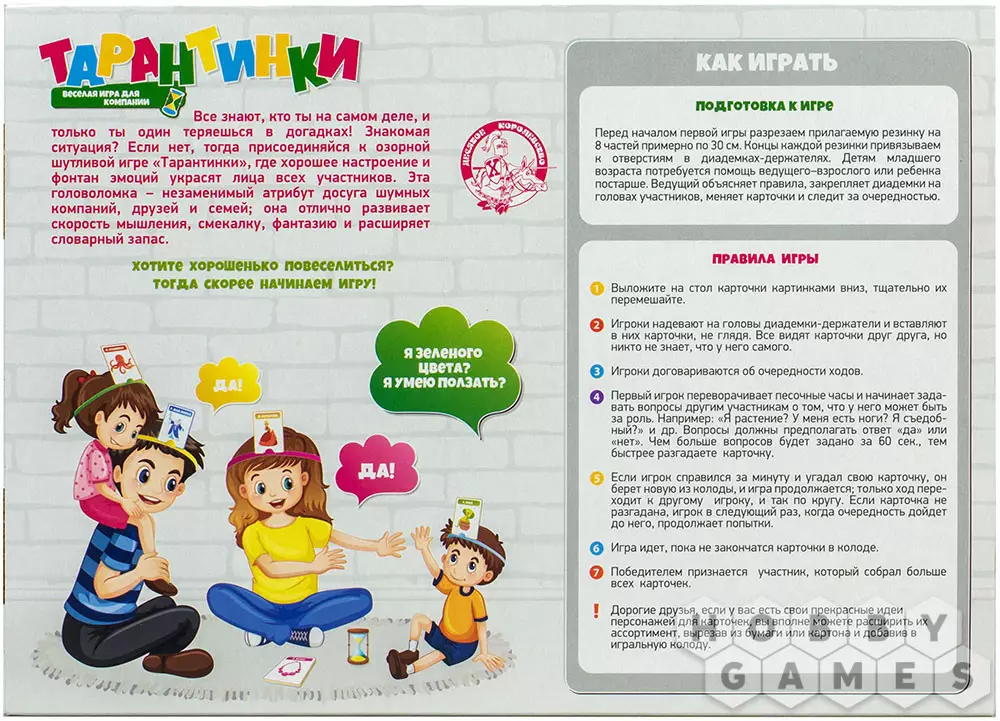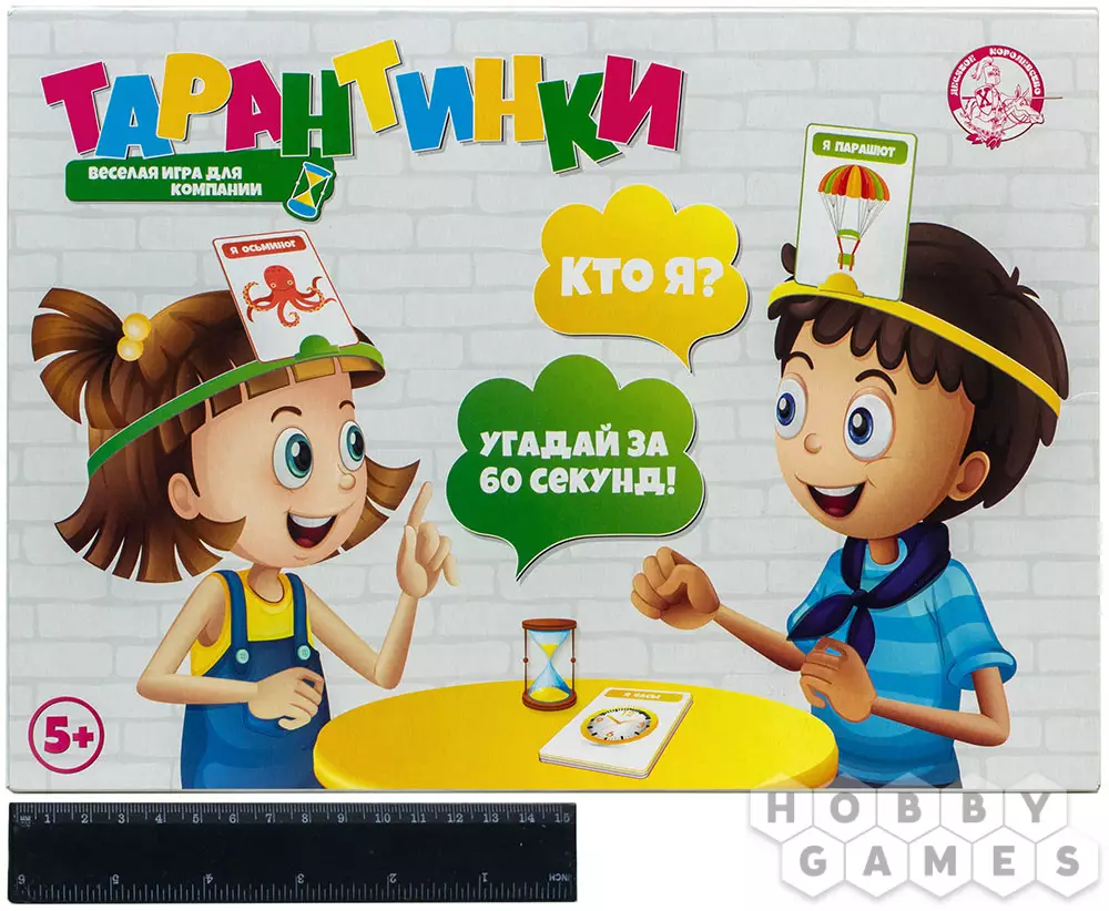 Все вокруг знают, кто ты на самом деле, и только ты один теряешься в догадках! Знакомая ситуация? Если нет, тогда рекомендуем открыть коробку и скорее начать озорную и шутливую игру "Тарантинки", где хорошее настроение и фонтан эмоций украсят лица всех участников. Эта весёлая настолка станет незаменимым атрибутом досуга шумных компаний друзей и семей. Она отлично развивает скорость мышления, смекалку, фантазию и расширяет словарный запас.