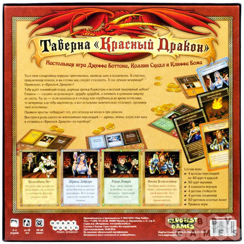"Таверна Красный Дракон" – это карточная настольная игра для 2-4 игроков в сеттинге классического фэнтези. Однако, вместо того, чтобы отправиться на поиски приключений, мы двинемся прямиком в… таверну! Там и будет происходить весь игровой процесс. Задача игроков – перепить всех остальных, удержаться на ногах, сохранить при этом побольше золота и вообще хорошо отдохнуть! Попутно будем играть в азартные игры, мухлевать и жулить, мериться силой и, конечно, пить всё, что пьётся, от медовухи до эльфийского вина с запивоном!