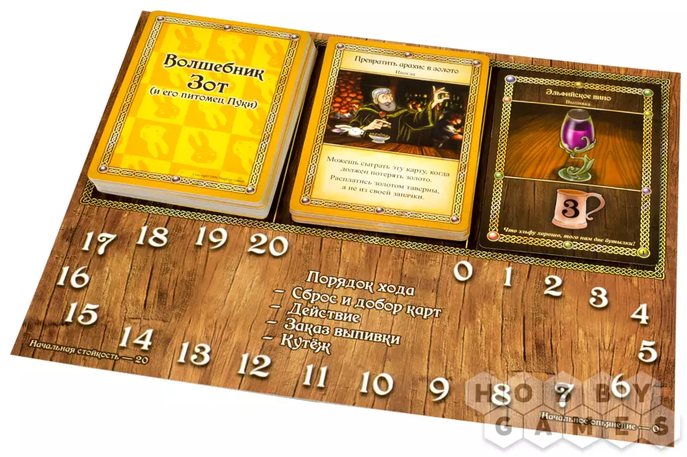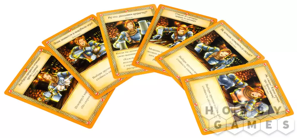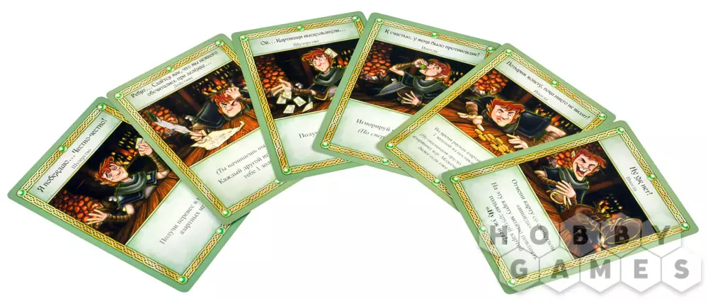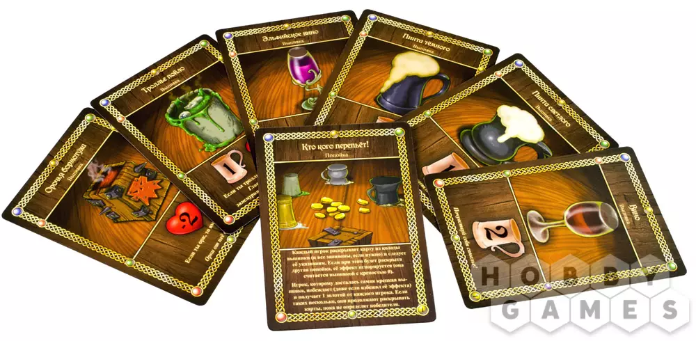 - Заказ выпивки – вы должны взять верхнюю карту из колоды Выпивки и положить её взакрытую любому игроку! Угощайся, друже! Если колода выпивки пуста, все игроки должны заплатить по 1 золотому, чтобы из погреба принесли ещё пойла!