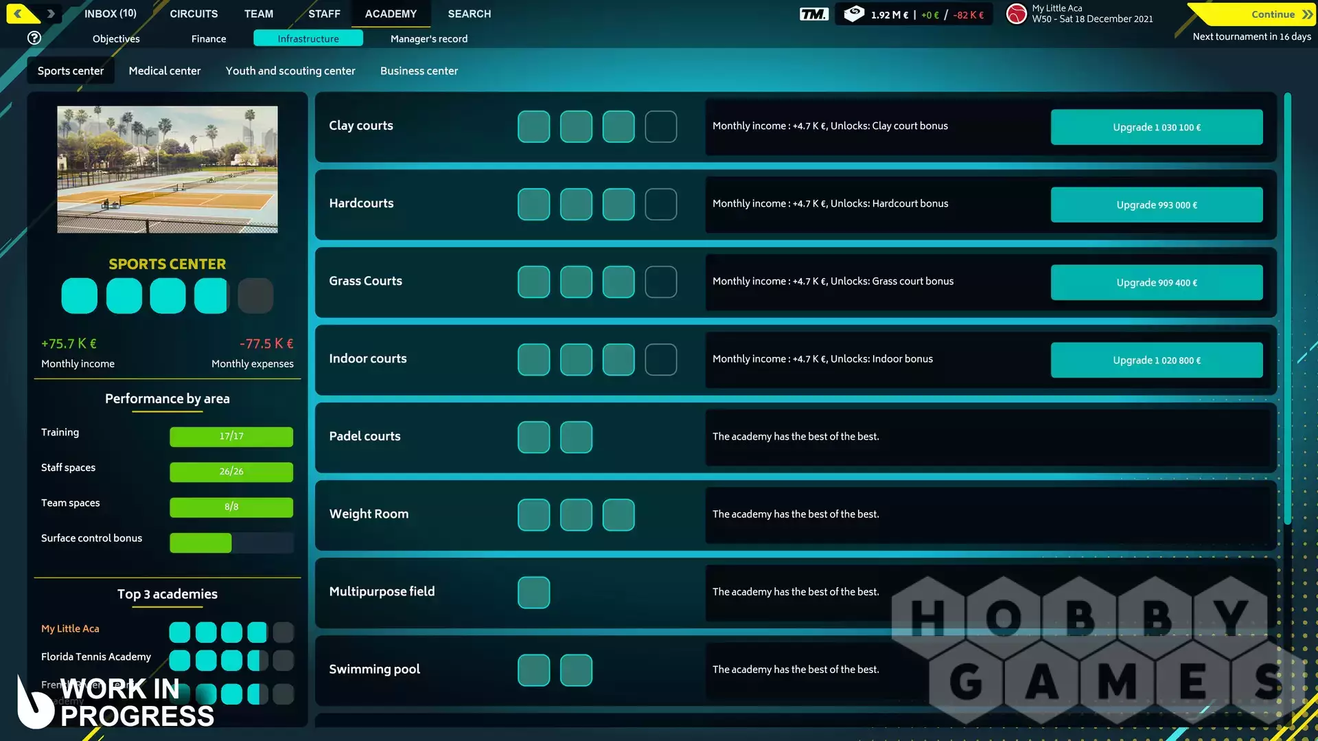 Новая система инфраструктуры сделает различные инвестиции ещё реалистичнее и поможет погрузиться в жизнь управляющего академией. Хотите специалистов по глиняным кортам? Тогда обеспечьте свою структуру охряными тренировочными площадками. Не нравится, как работают ваши скауты? Инвестируйте в центр обучения и ускоряйте оценку. Вы управляющий, вам и решать!