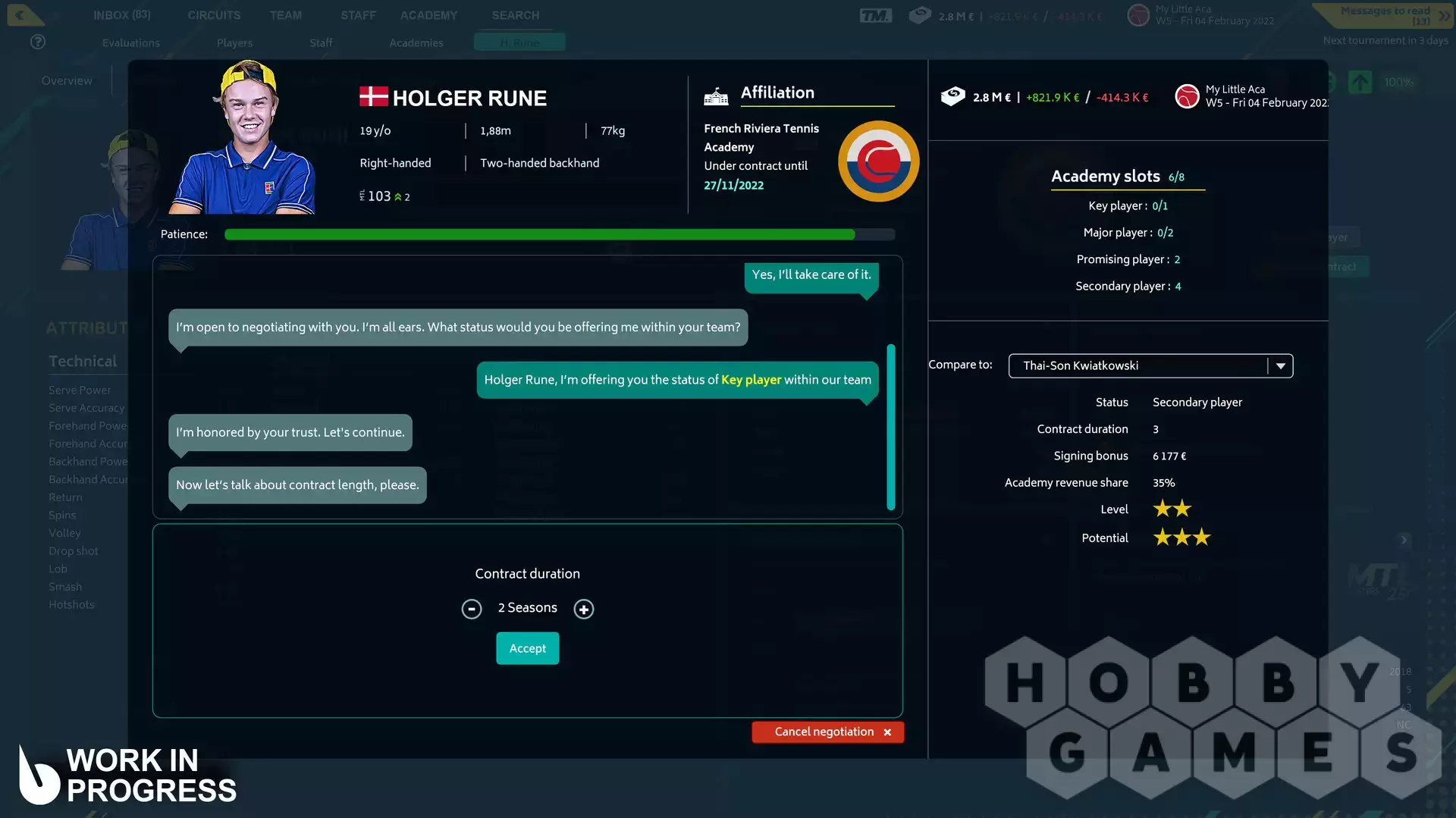Договаривайтесь с талантами и заключайте контракты, размечающие жизнь академии. Система переговоров была доработана и отражает реалии делового мира: теперь она включает и контракты, и спортивные цели игроков, и соглашения с поставщиками инвентаря... Агент академии получил важнейшую роль в развитии вашей империи.