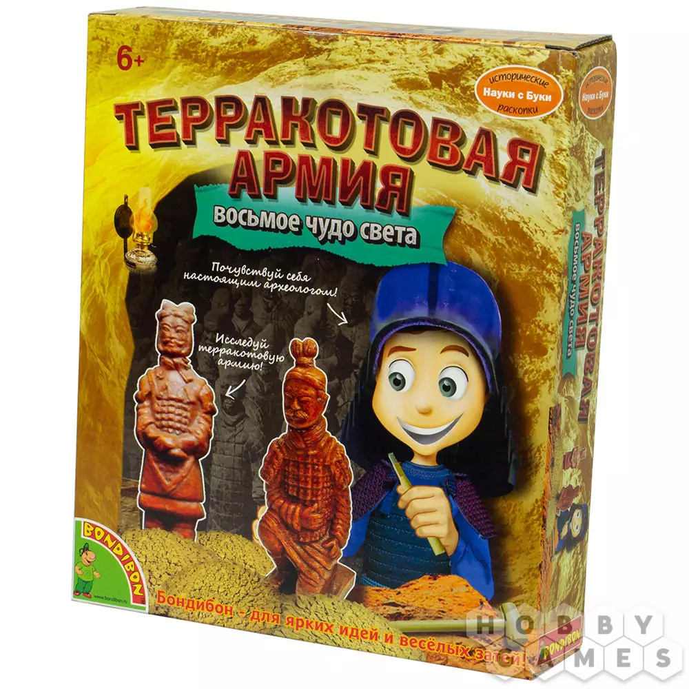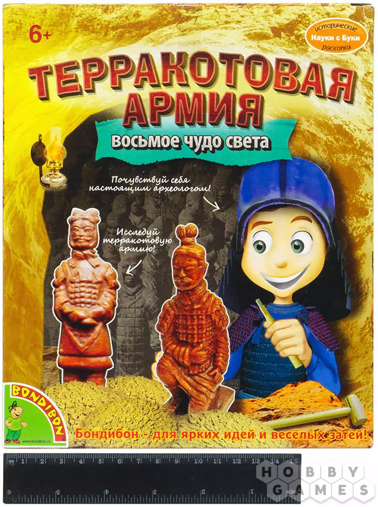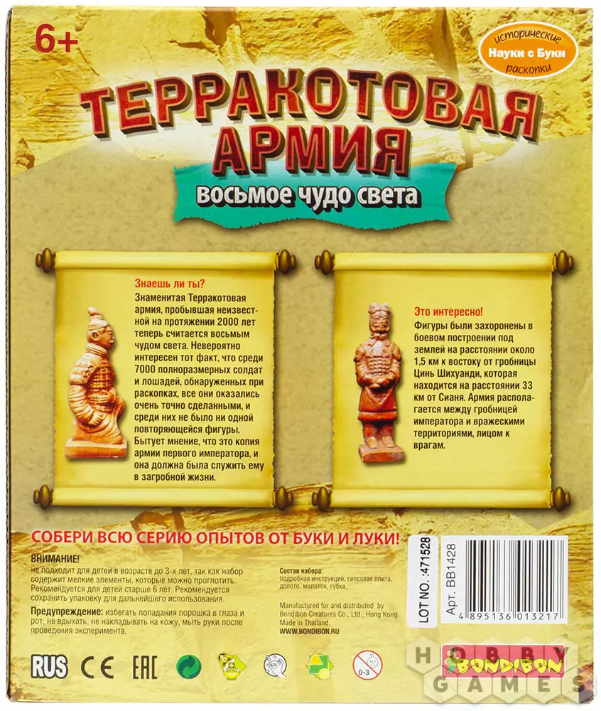 Обучающий набор, который попал к вам в руки, подарит вам возможность почувствовать себя настоящим археологом и самостоятельно обнаружить замурованную терракотовую армию. Используя долото, молоток и губку, вы сможете расколоть гипсовую плиту и вынести на свет изваяние древнего китайского воина. Погрузитесь в атмосферу загадочных и притягательных тайн древности!