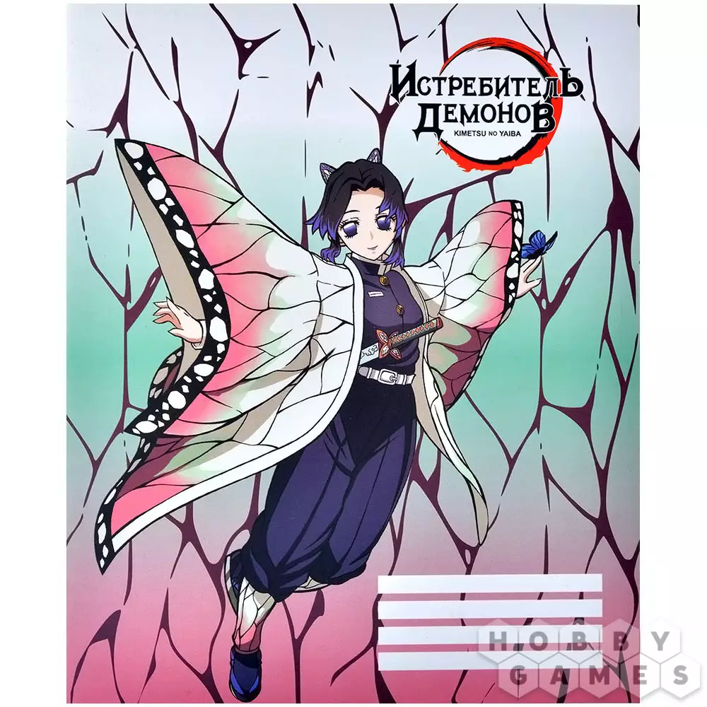 Но, впрочем, вернёмся к изображению на обложке тетради. Здесь мы видим жизнерадостную Шинобу Кочо – охотницу на демонов. В какой бы ситуации она ни находилась, почти всегда улыбка не покидает её лица. Но не стоит недооценивать эту миниатюрную девушку – хоть она и является самой маленькой среди всех, кто входит в Корпус Истребителей Демонов, у неё наблюдается недюжинная сила ударов и невероятная ловкость и проворность.