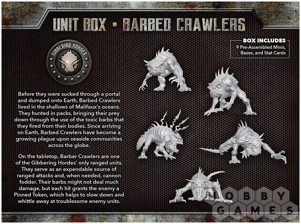 Даже среди хаотичных полчищ Gibbering Hordes есть своя иерархия. Barbed Crawlers – один из самых многочисленных видов (если слово "вид" вообще применимо к постоянно мутирующим тварям). Когда-то эти существа охотились в мелководных морях Malifaux, поражая жертв ядовитыми шипами. Теперь же они выползли на поверхность и рыщут по земле в поисках пищи и мест для новых кладок.