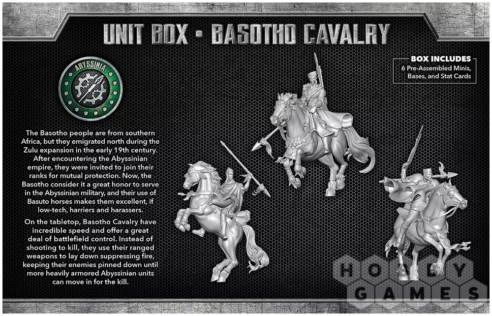 Народ басото родом из Южной Африки вселенной Malifaux, но в начале XIX века, спасаясь от экспансии зулусов, мигрировал на север. Столкнувшись с Abyssinian Empire, они получили предложение вступить в её ряды – с целью обеспечить защиту обеим сторонам. Со временем служба в армии стала для басото делом чести. Благодаря своим исключительным навыкам верховой езды они стали играть особую роль в сражениях. Так, в то время как Basotho Cavalry обрушивает на врага шквальный огонь, сковывая его манёвры, более медленные войска успевают занять выгодные позиции.