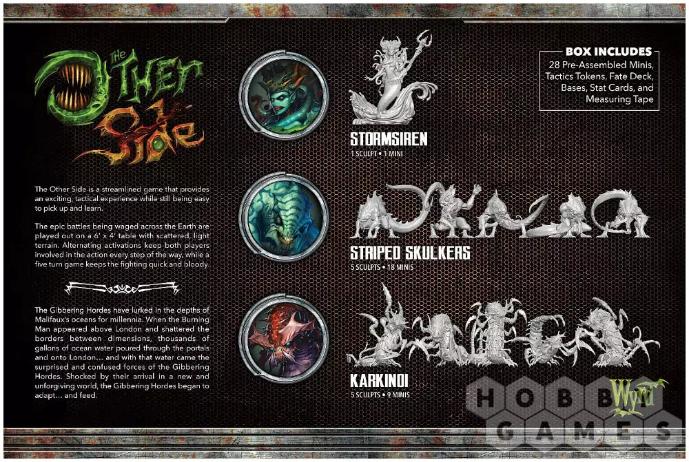 The Other Side – это игра о фракциях, сражающихся по всей Земле в борьбе за превосходство и выживание. Выводя на поле 32-миллиметровые миниатюры, игроки будут управлять отрядами, могущественными командирами и огромными титанами, дабы одержать победу и взять контроль над планетой. Исход битвы разрешается с помощью колоды карт, что позволяет сторонам иметь больший контроль над судьбой своих воинов. Хотя события The Other Side разворачиваются во вселенной Malifaux, эти игры несовместимы.