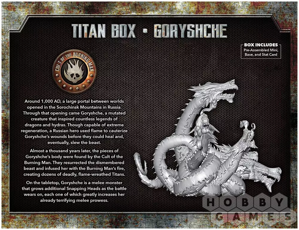 Однажды в России вселенной Malifaux разверзся портал между мирами, из которого появилась Goryshche – мутировавшее создание, ставшее прототипом для бесчисленных легенды о драконах и гидрах. Хитрая и умная, она заманивала людей в своё горное логово, где в конечном счёте пожирала. Тогда жители решили объединиться против чудовища и изничтожили его помощью огня.