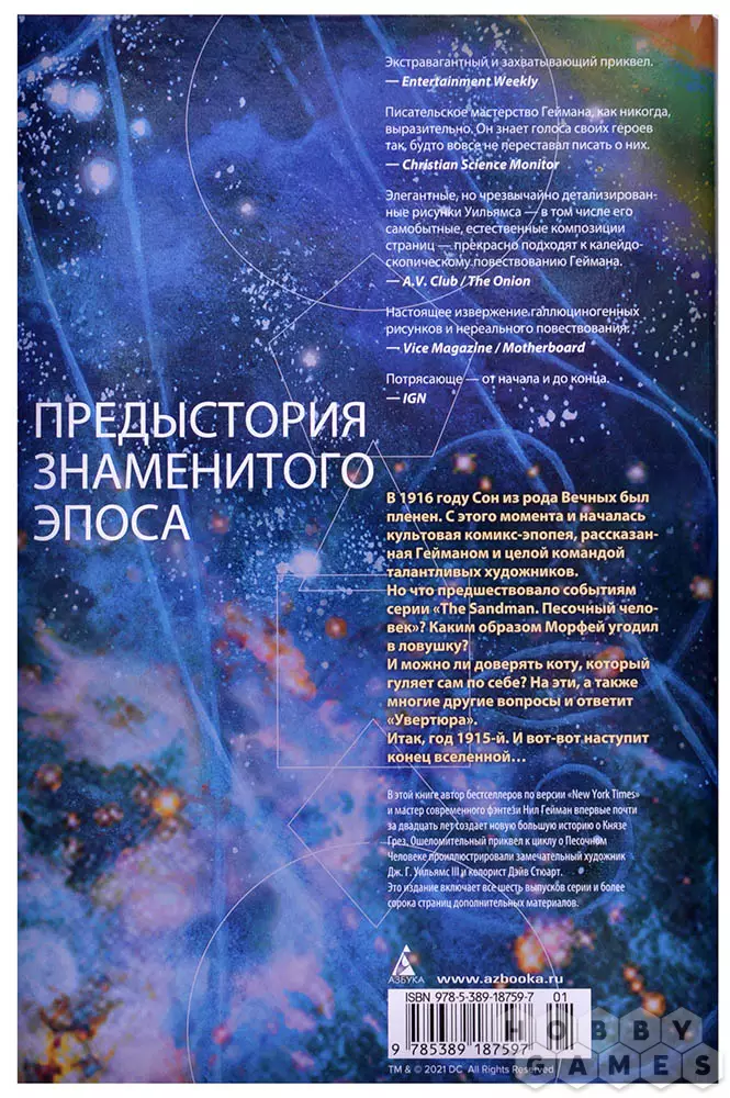 В центре повествования находится один из семи Великих – а именно Сон. Он же Морфей, он же Принц Историй, он же Песочный человек. Он проследует с вами от начала до самого конца этой истории, что будет затягивать своей абсурдностью и фантасмагоричностью всё глубже, словно сладкая дрёма. Вы побываете в разных мирах и эпохах, узнаете, как выглядело безбрежное пространство Космоса в допотопные времена и даже познакомитесь со звёздами – которые в мире "Песочного человека" могут не только ярко сиять на ночном небе, но имеют свои характеры. В обществе самых разных личностей из числа богов, смертных, ангелов и демонов, вы сможете окунуться в удивительный мир, созданный Нилом Гейманом и таящий множество странных загадок.