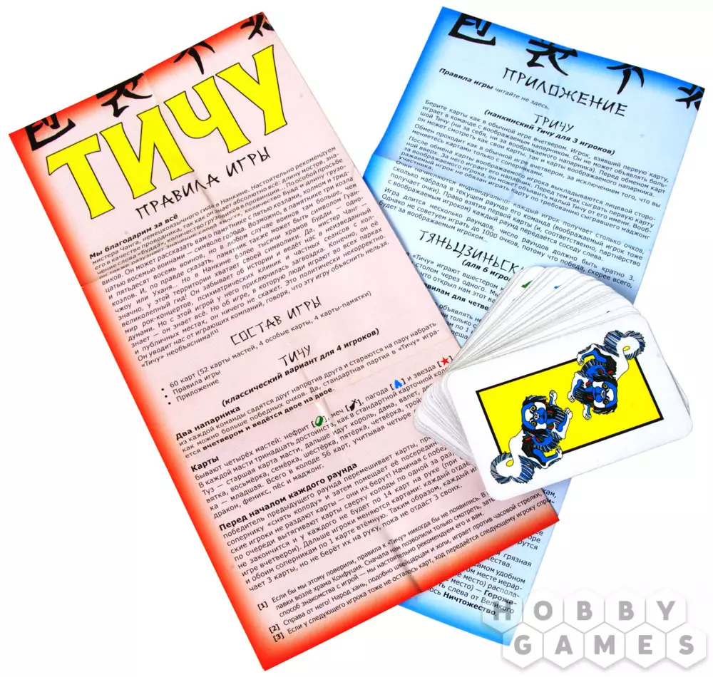 "Тичу" – это народная китайская игра, которая покорила сердца многих любителей настольных игр по всему миру и теперь добралась до России! Поделитесь на две команды и совместными усилиями постарайтесь одержать победу. Спасайте своего напарника, выкладывайте выгодные комбинации, блефуйте, разыгрывайте особые карты - и вскоре вы сможете победить китайских мастеров "Тичу".