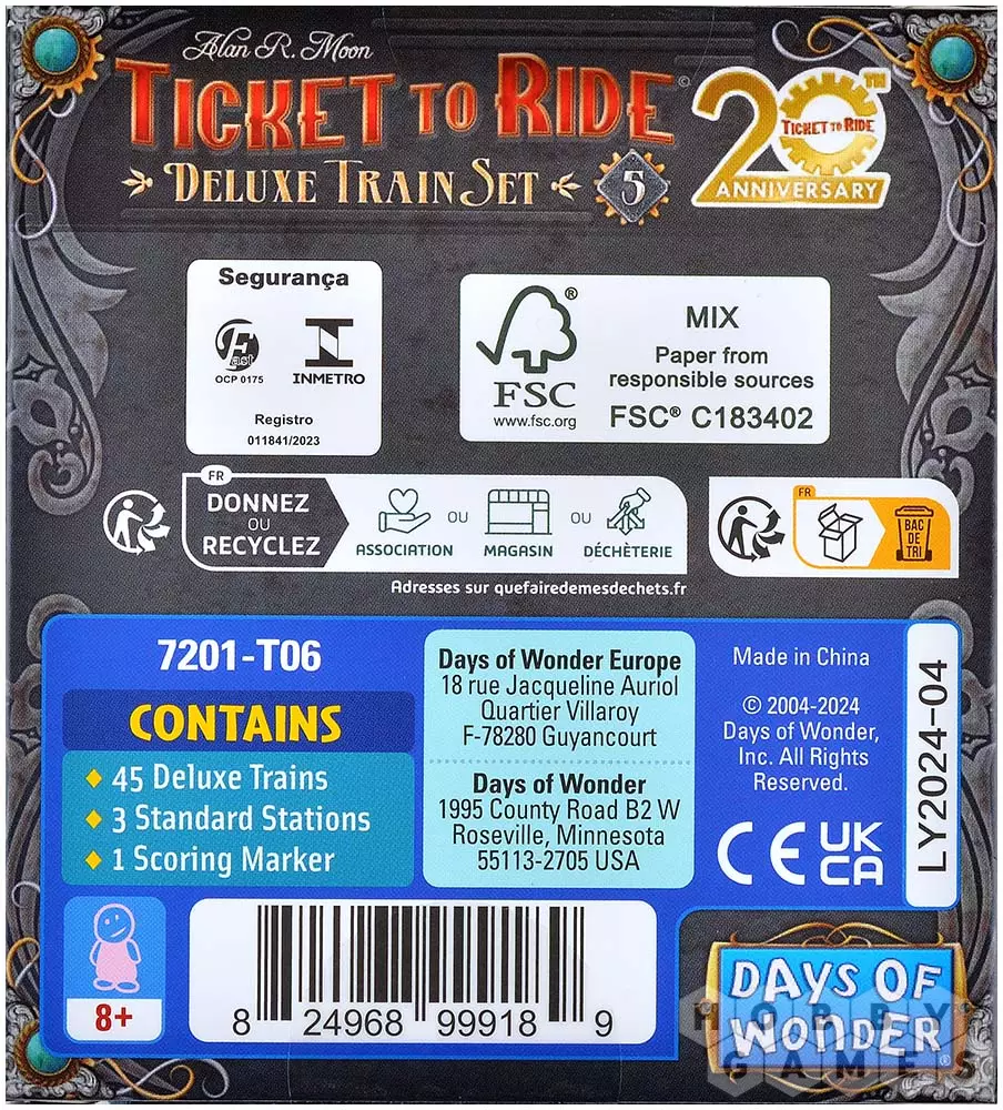 Представляем вашему вниманию делюкс-набор с тремя станциями, маркером подсчёта очков и изящными вагончиками чёрного цвета. Изысканный дизайн, сближающий эти вагончики с самой ночью, тонкая детализация, элегантная цветовая сдержанность – от всего этого веет роскошью, которая наверняка придётся вам по вкусу.