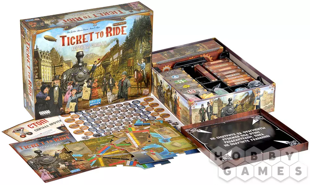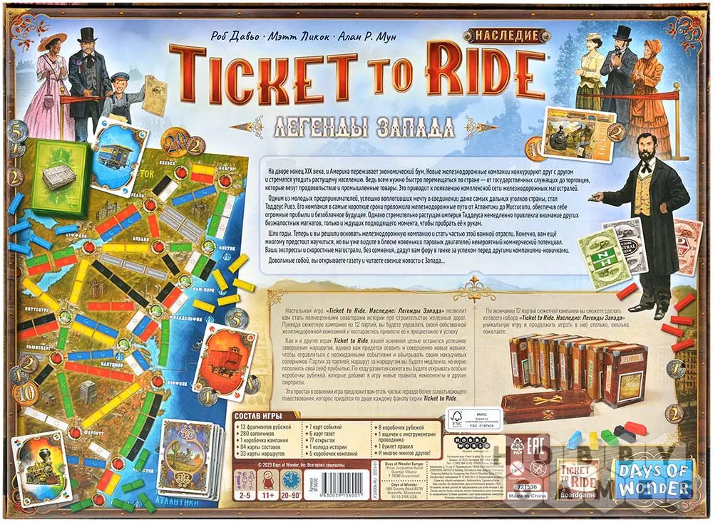 "Ticket to Ride. Наследие: Легенды Запада" – это новая часть легендарной серии Ticket to Ride, также известной как "Билет на поезд". Основные механики остались без изменений, но теперь формируют целую сюжетную кампанию из 12 партий, в которой каждый игрок будет пытаться привести к успеху свою железнодорожную компанию.