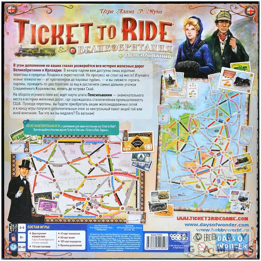 Дополнение "Ticket to Ride: Великобритания и Пенсильвания" откроет вам новые места для посещения. Вы сможете побывать в Туманном Альбионе, от столичного Лондона до самых удалённых уголков Соединённого Королевства и северных островов, проехав через всю Великобританию, – после того, как изучите новые технологии и улучшите свои поезда, конечно же.