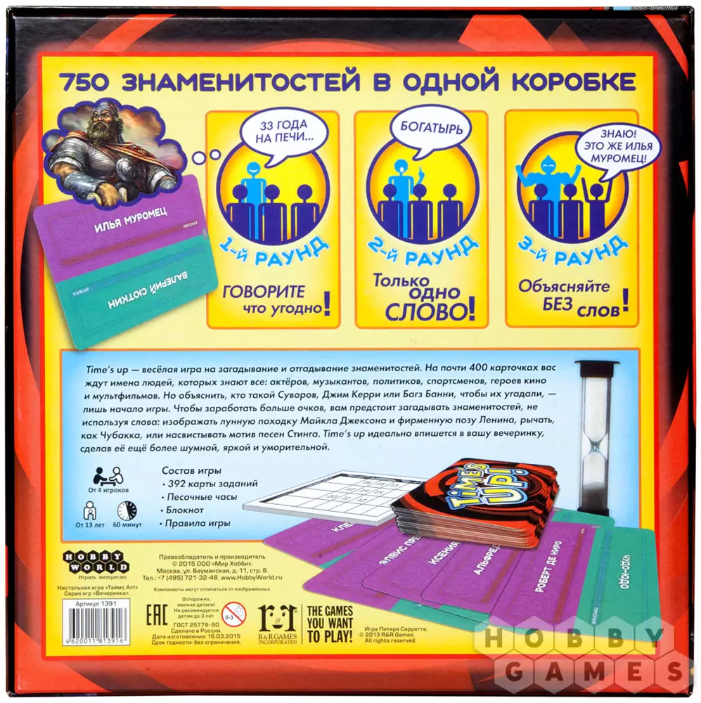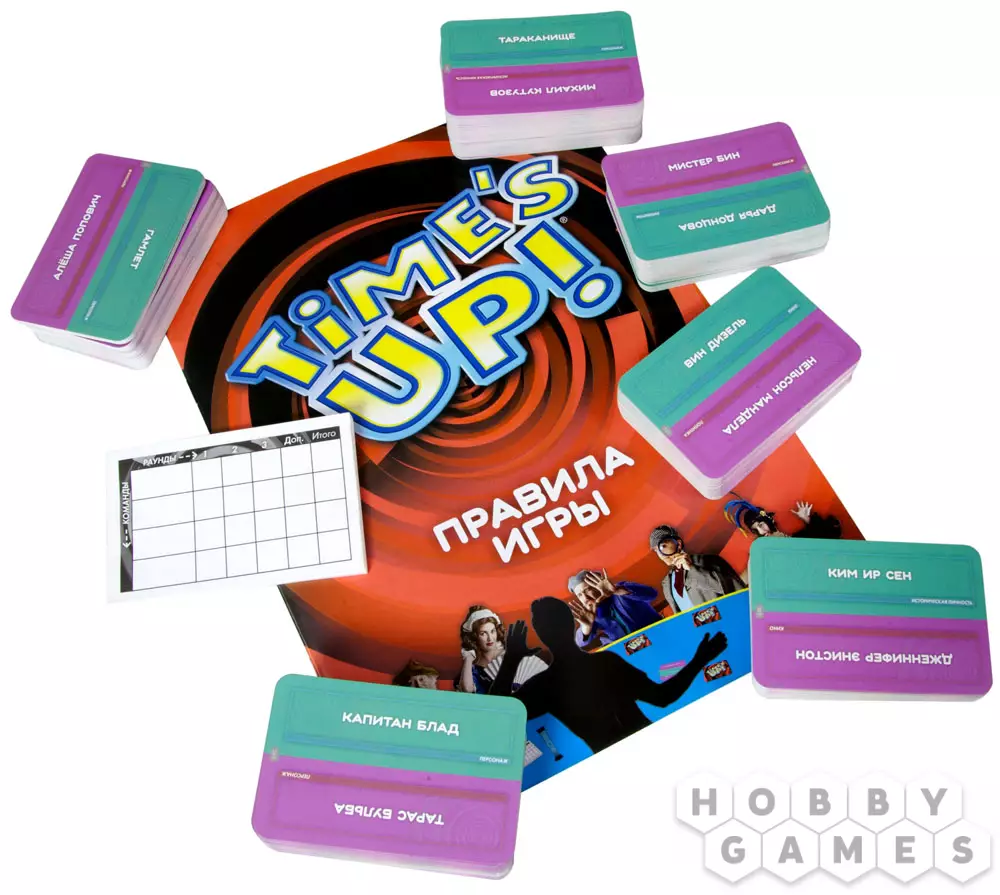 Сколько знаменитых актёров, учёных, музыкантов, политиков, спортсменов и персонажей фильмов и мультфильмов вы знаете? Настольная игра Time's Up! поможет вам выяснить это! Загадывайте и угадывайте известных людей и героев. Но описать их с помощью слов – только первый этап. Для того чтобы набрать больше очков, объясняйте имена, используя свою смекалку и актёрские таланты, давайте чёткие ассоциации или изображайте известные роли!