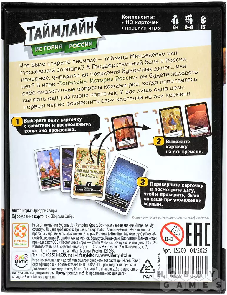 Что было раньше – открытие Третьяковской галереи или падение Тунгусского метеорита? А когда была премьера легендарного балета "Лебединое озеро"? Вместе с игрой "Таймлайн: История России" вам предстоит это выяснить и разобраться, как располагались памятные события истории на ленте времени. Ваша задача проста: первым выложить карты на оси времени. И главное, сделать это в правильной последовательности! Вам предстоит выяснить, насколько хорошо вы знакомы с историей России, а ещё узнать много новых и увлекательных фактов о ней.