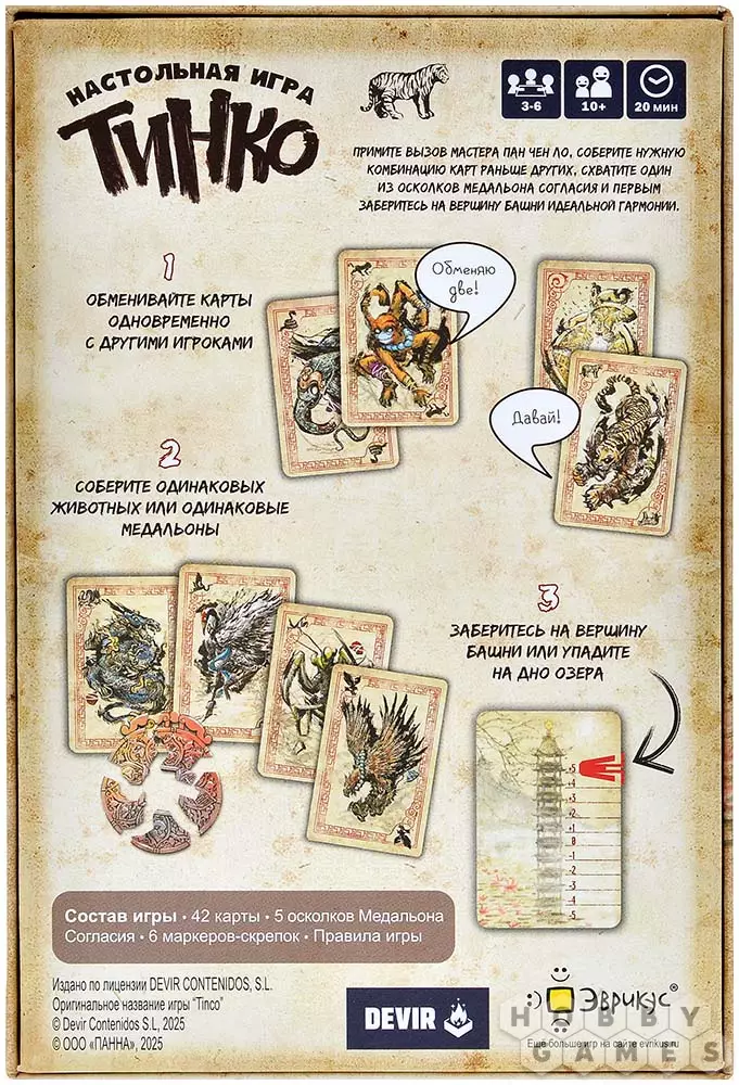 Игра начинается с выбора испытания: либо собирать карты с одинаковыми животными, либо с осколками одного цвета. Карты раздаются поровну, а в центр кладётся на один осколок медальона меньше, чем игроков. Партия идёт в бешеном темпе – все одновременно предлагают обмен картами, выкрикивая числа. Нашли партнёра с таким же количеством? Меняйтесь! Главное – первым собрать пять нужных карт и незаметно схватить осколок. Как только это происходит, остальные игроки бросаются за оставшимися осколками – ведь их всегда меньше, чем участников!