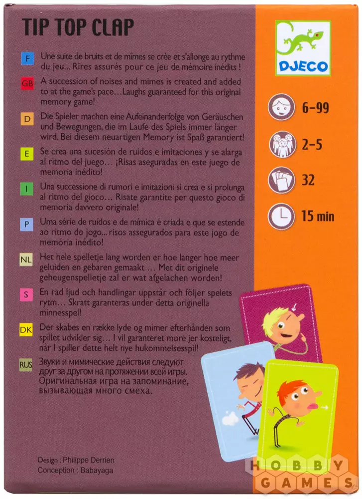 Оригинальная карточная игра Tip Top Clap не оставит равнодушными ни детей ни взрослых и запомнится надолго! Игровой набор содержит 32 карточки со звуками и мимическими действиями. Суть игрового процесса в том, что участник, открывая карточку, воспроизводит звук или действие на ней изображенное, следующий – повторяет за ним, открывает карту и выполняет новое задание, и так далее. Как только кто-то ошибётся, он проигрывает.