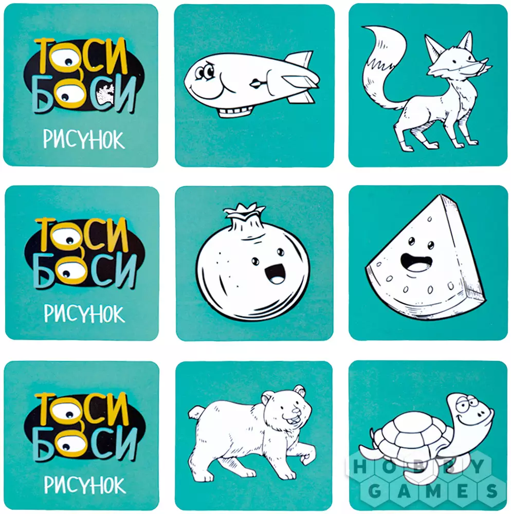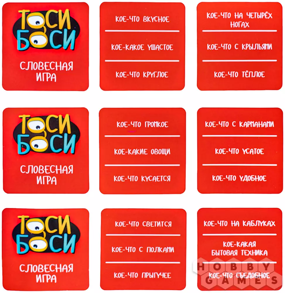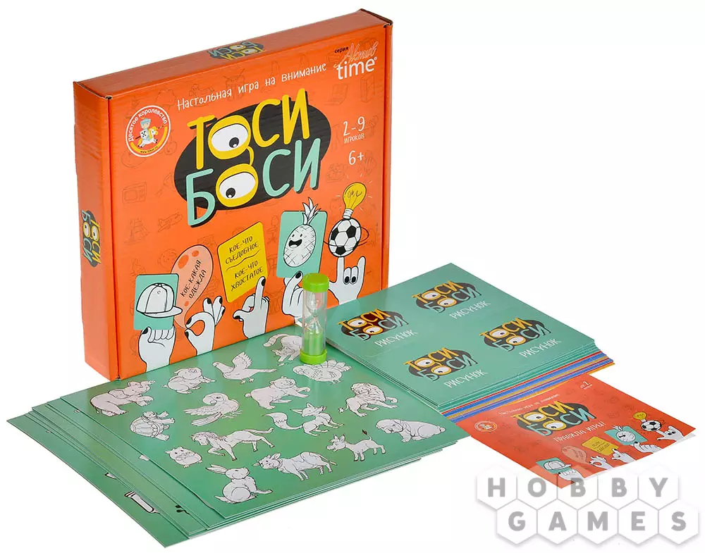 "Тоси Боси" – прекрасный вариант развивающей игры для детей. Вы будете тянуть карточки, на которых изображён или каким-либо образом описан какой-то объект. Этот объект нужно будет найти на игровом поле 3x3 – и сделать это не только прежде, чем закончится время, но и быстрее соперников. Тот, кому удастся первому обнаружить загаданный предмет в мешанине разных картинок, должен крикнуть "Тоси Боси!" и забрать карточку себе, став на шаг ближе к победе. А если вы захотите немного усложнить игру, переверните поле – на обратной стороне представлена версия для опытных игроков. Скучно не будет ни детям, ни родителям!