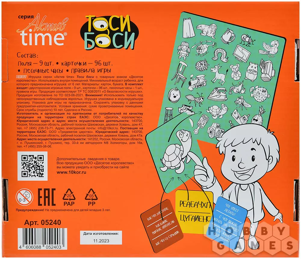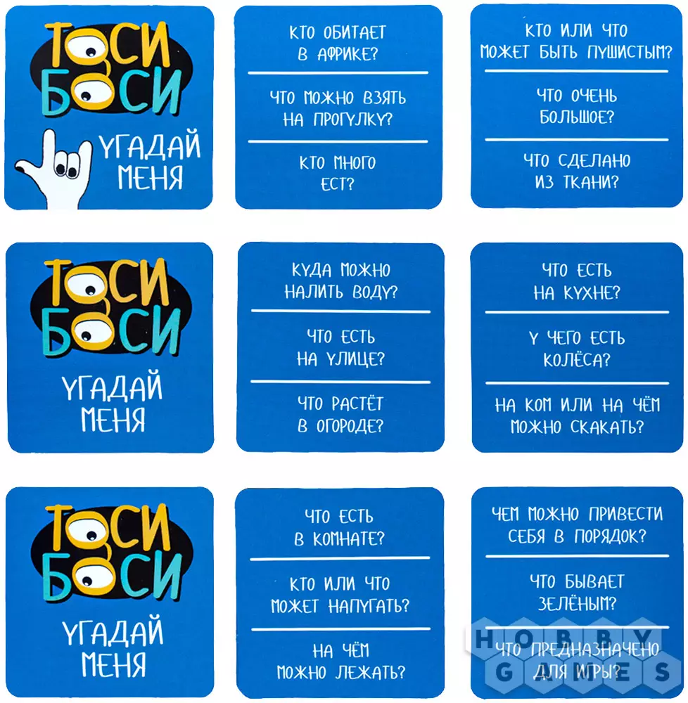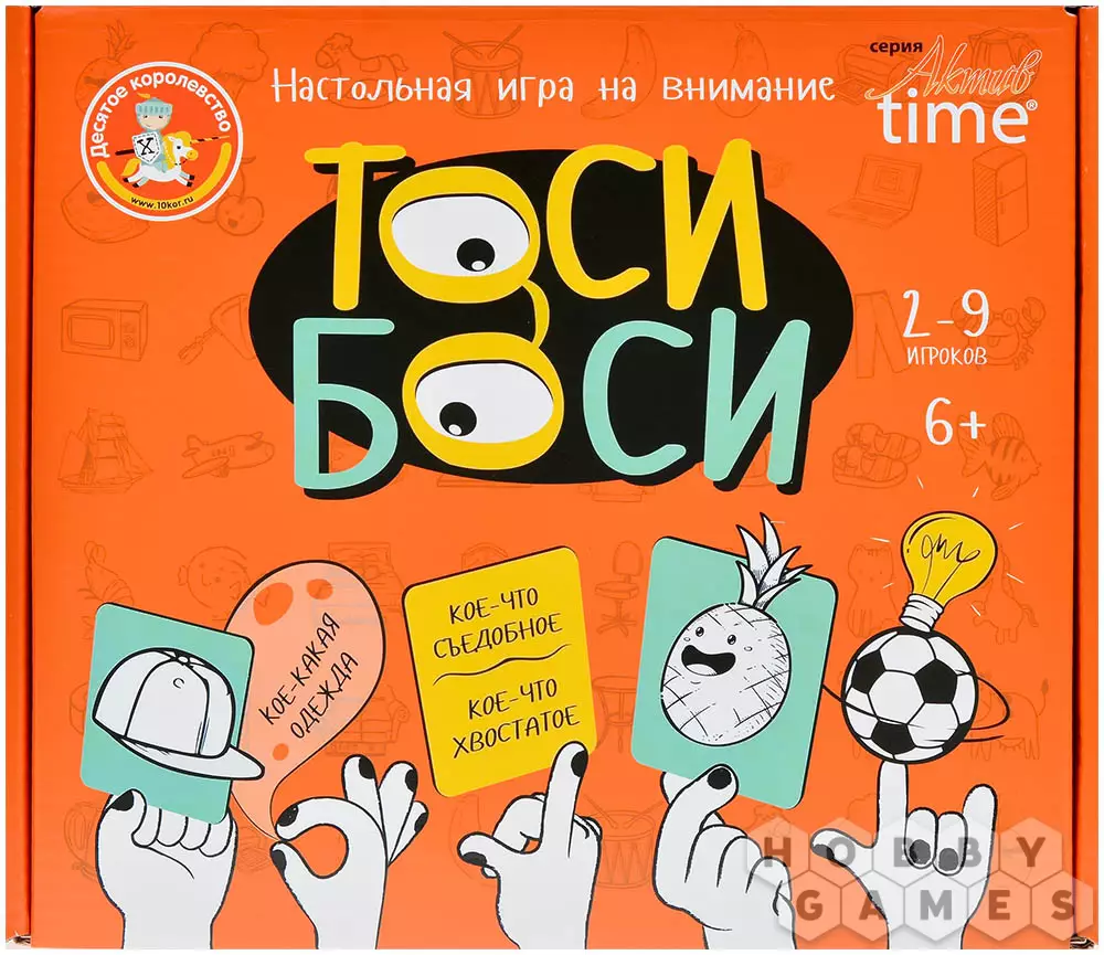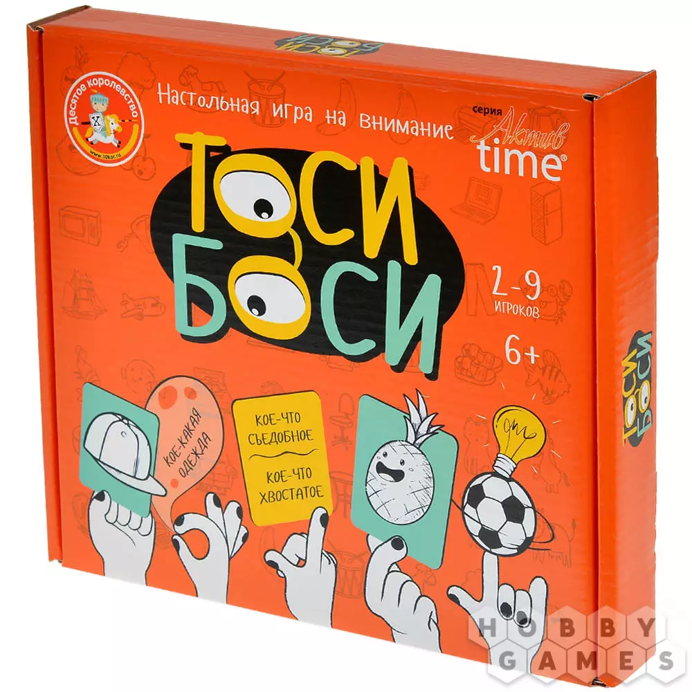 "Тоси Боси" – прекрасный вариант развивающей игры для детей. Вы будете тянуть карточки, на которых изображён или каким-либо образом описан какой-то объект. Этот объект нужно будет найти на игровом поле 3x3 – и сделать это не только прежде, чем закончится время, но и быстрее соперников. Тот, кому удастся первому обнаружить загаданный предмет в мешанине разных картинок, должен крикнуть "Тоси Боси!" и забрать карточку себе, став на шаг ближе к победе. А если вы захотите немного усложнить игру, переверните поле – на обратной стороне представлена версия для опытных игроков. Скучно не будет ни детям, ни родителям!
