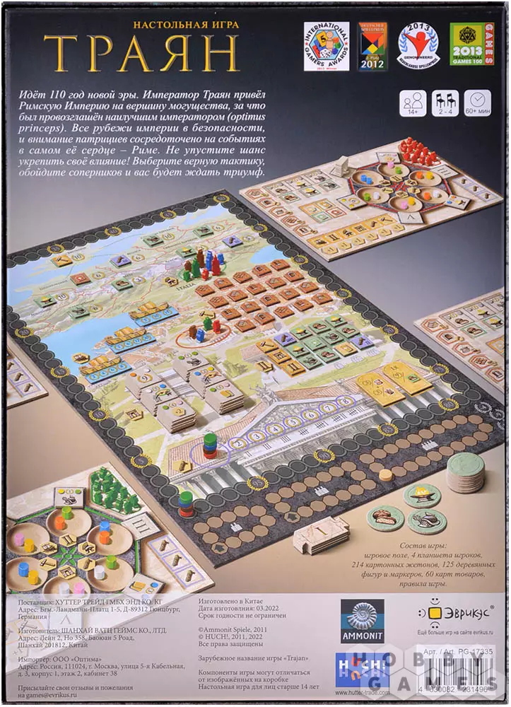 В стратегической настольной игре "Траян" игроки перенесутся во времена, когда Римская империя находилась в самом расцвете. Имея в своём распоряжении полководцев и подданных, игрокам на протяжении игрового года предстоит совершать различные действия: от строительства и торговли до военных кампаний и роста влияния в сенате. Все эти действия приносят победные очки, но не стоит забывать, что "Траян" – стратегическая игра, поэтому для каждого действия нужно выбрать наиболее подходящий момент, чтобы эффект от него был максимально полезен.