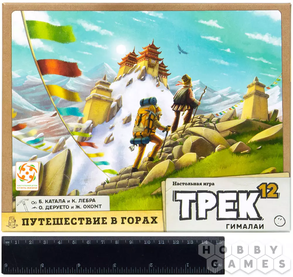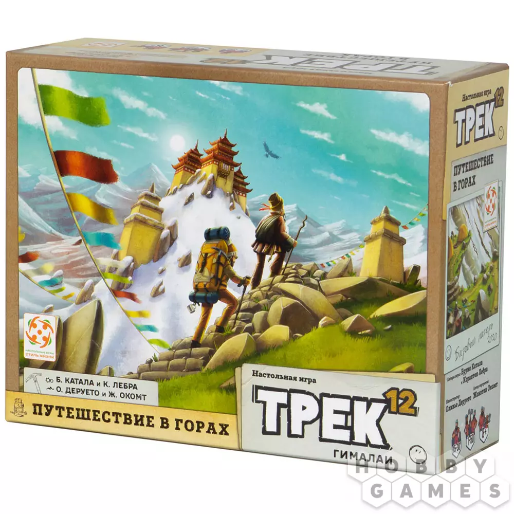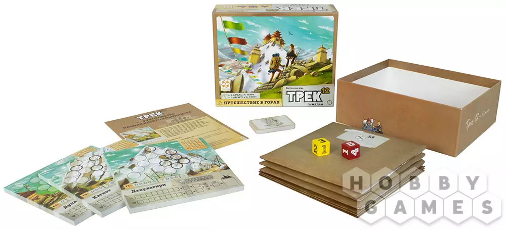 В настольной игре "Трек 12: Гималаи" вам предстоит совершить подъём в горы. Или спуск. Маршрут вы вольны выбирать какой вздумается, ведь главной целью игры будет пройти маршрут лучше всех и набрать как можно больше очков. А чем больше участников, тем сложнее это сделать, ведь играть можно компанией до 50 человек! Механика игры представляет собой roll'n'write, по-русски "брось и пиши": вы будете бросать 2 игральных кубика, а полученные результаты записывать в свой лист маршрута. Кстати о маршруте: он состоит из 19 пустых ячеек, расположенных рядом друг с другом. Чтобы получить победные очки, вам предстоит строить цепочки (числа в соседних ячейках должны идти по порядку) и области (в соседних ячейках должны быть одинаковые числа). Чем длиннее цепочки и больше области, тем больше победных очков они принесут вам в конце игры. Бросив кубики, вы можете выбрать и вписать один из 5 результатов: