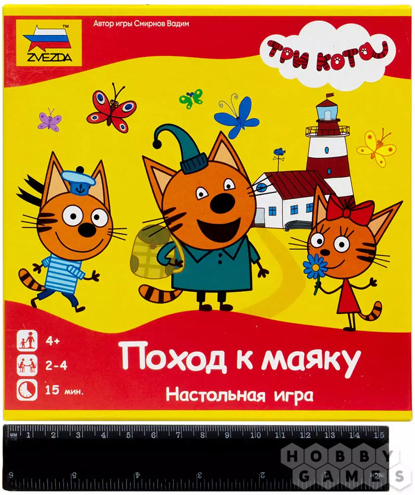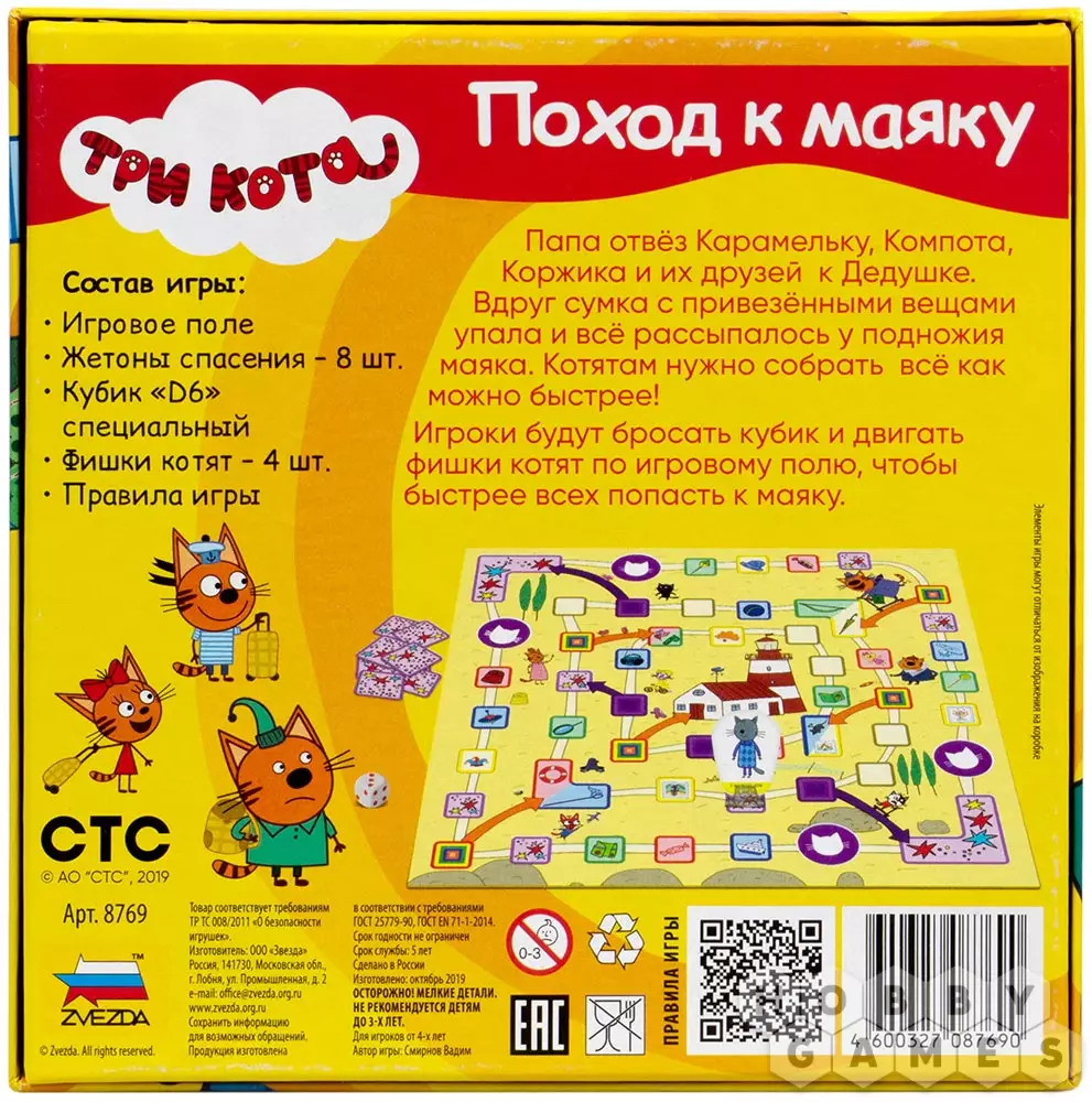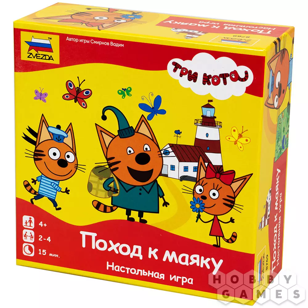 В настольной игре "Три кота. Поход к маяку" вещи котят оказались разбросаны у подножия маяка. Котята решили объединить полезное занятие с игрой. Так вещи стали сокровищами, а котята отважными исследователями. Бросайте кубик, передвигайте персонажей и соберите их все.
