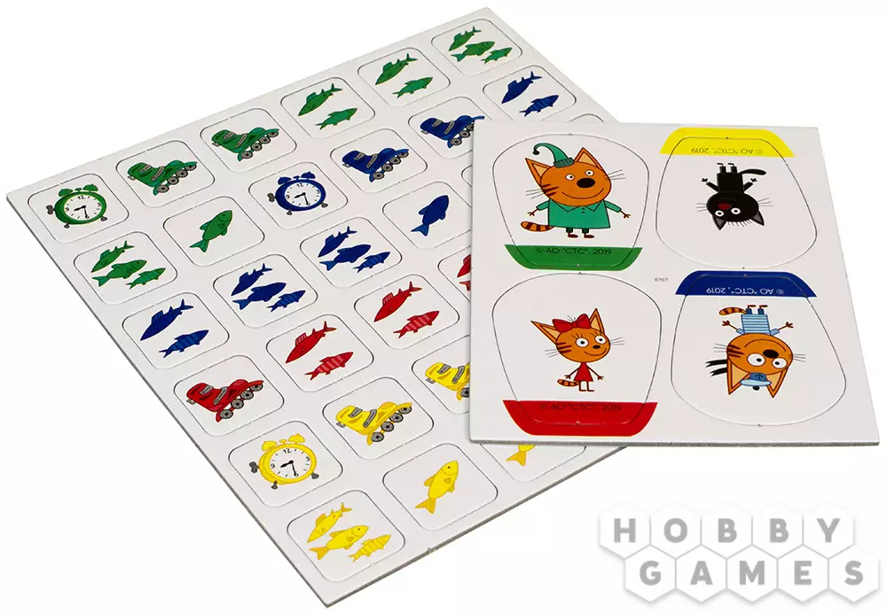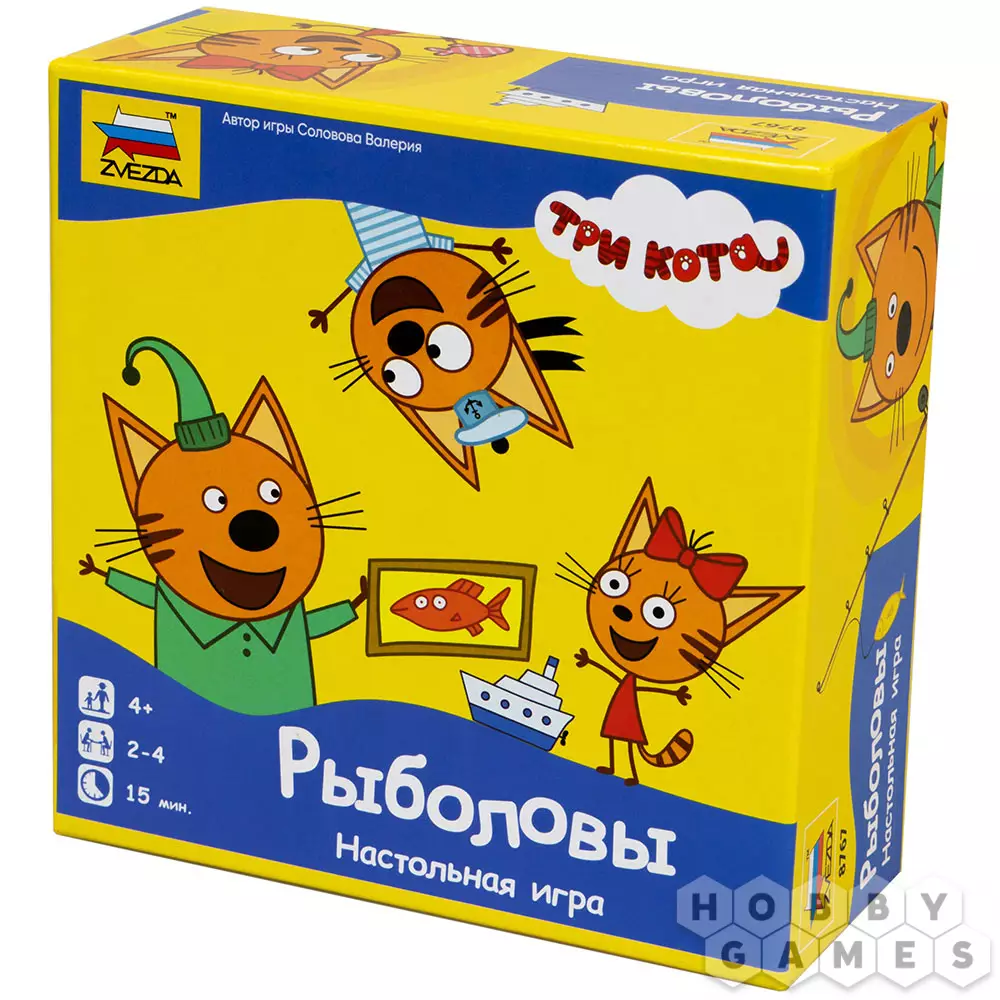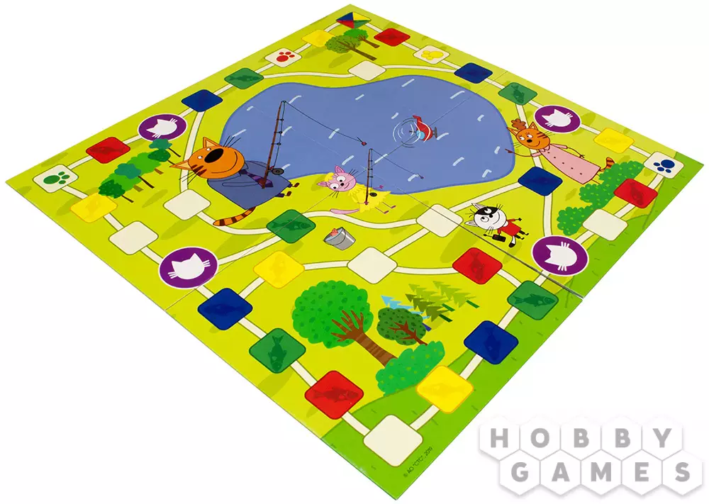 В настольной игре "Три кота. Рыболовы" игроки отправляются на рыбалку к озеру, чтобы принести домой самый большой улов. Механика простая – бросайте кубики и перемещайте своего котёнка на выпавшее число шагов и подбирайте фишку с уловом.