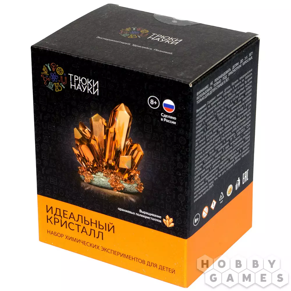 Используя этот набор, Вы сможете создать настоящий оранжевый кристалл! Если следовать инструкции и всё сделать правильно, то у Вас получится поликристалл, сформированный из разнонаправленных кристаллических зёрен. Опыт демонстрирует быстрый рост кристаллов из насыщенного раствора дигидроортофосфата аммония.