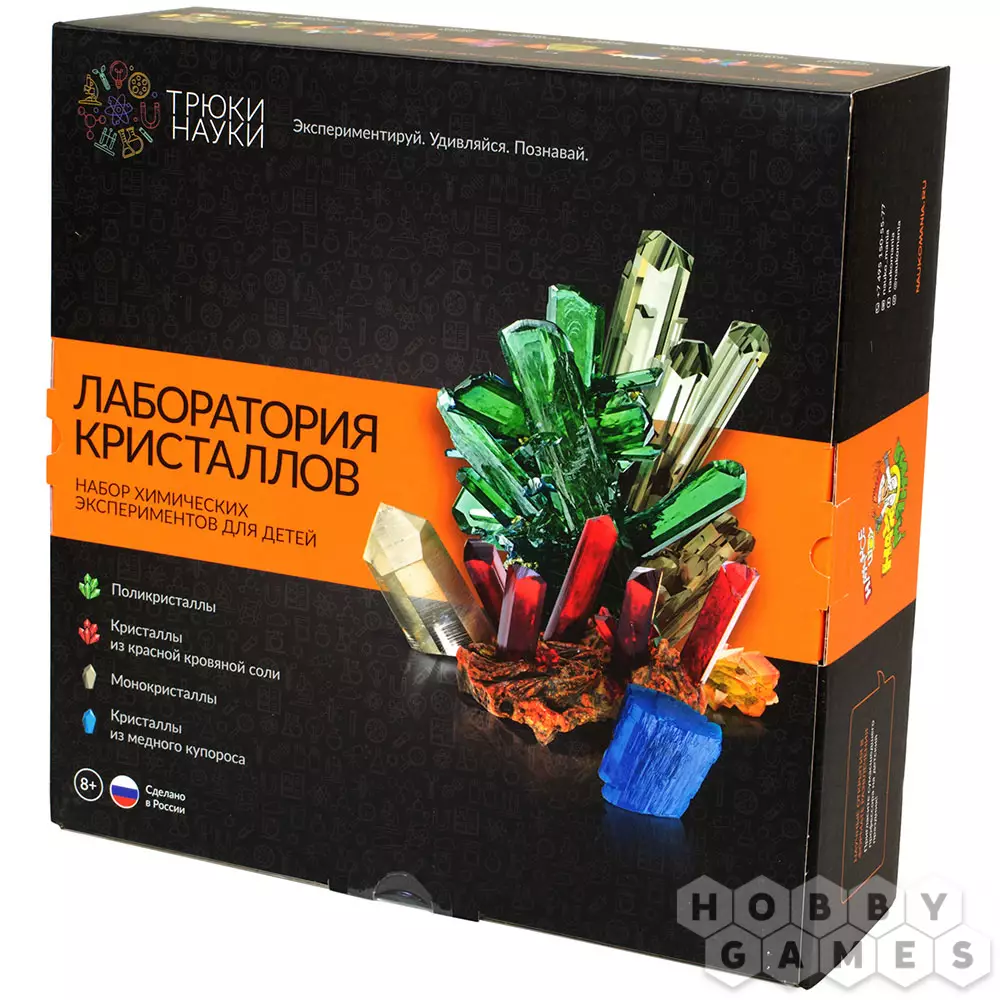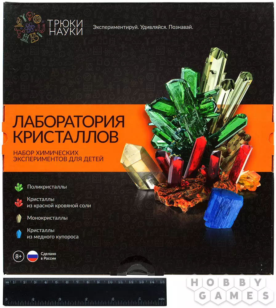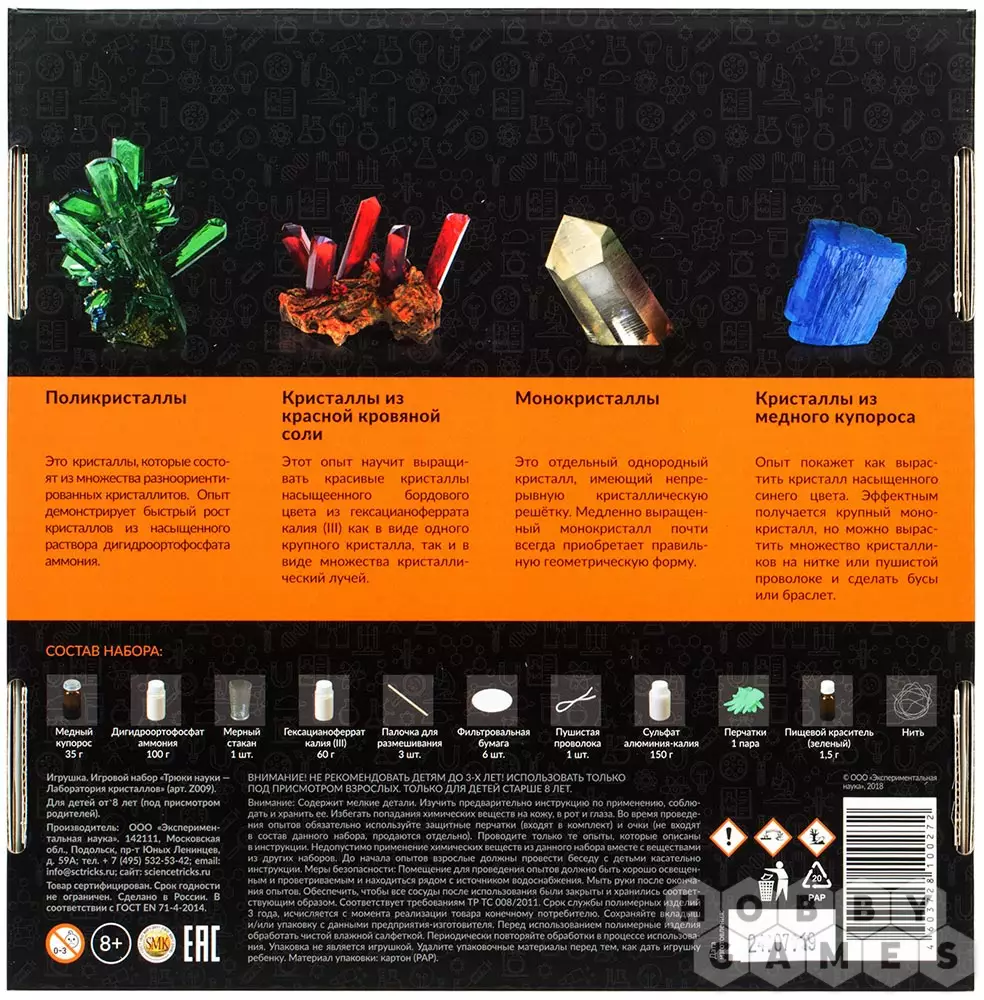 Используя этот набор, вы сможете создать настоящие кристаллы! Если следовать инструкции и всё сделать правильно, то у вас получатся поликристаллы, кристаллы из красной кровной соли, кристаллы из медного купороса или же монокристаллы, сформированные из разнонаправленных кристаллических зёрен. Опыт демонстрирует быстрый рост кристаллов из насыщенного раствора дигидроортофосфата аммония.