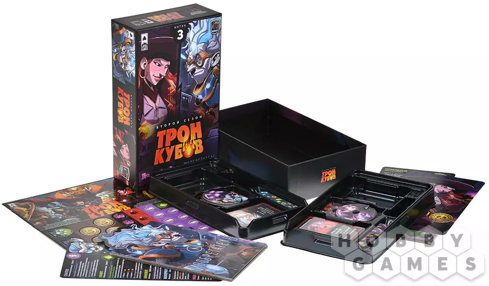 "Трон кубов" – это серия дуэльных настольных игр, посвящённых противостоянию героев с уникальными способностями. Быстрые партии, простые правила и великолепное оформление – вот главные преимущества серии. Каждая часть игры содержит в себе два комплекта героев, а если объединить несколько коробок, то получится сыграть и в одном из нескольких командных режимов: 2x2, 3x3 или даже 2x2x2. Играть и правда очень просто: сперва вы бросаете кубики, чтобы получить необходимую комбинацию и активировать одну из способностей, потом улучшаете способности и разыгрываете карты действий. Как только здоровье одного из героев снижается до нуля, он погибает и проигрывает.