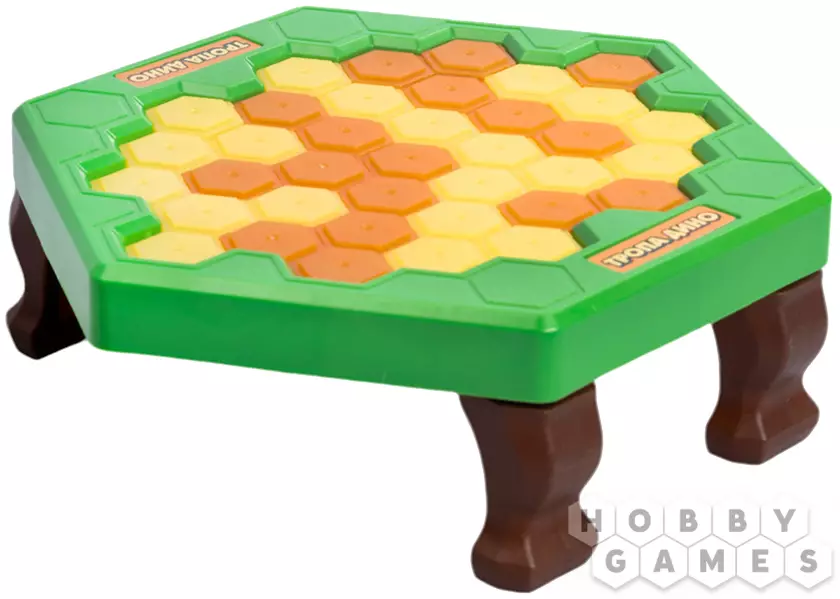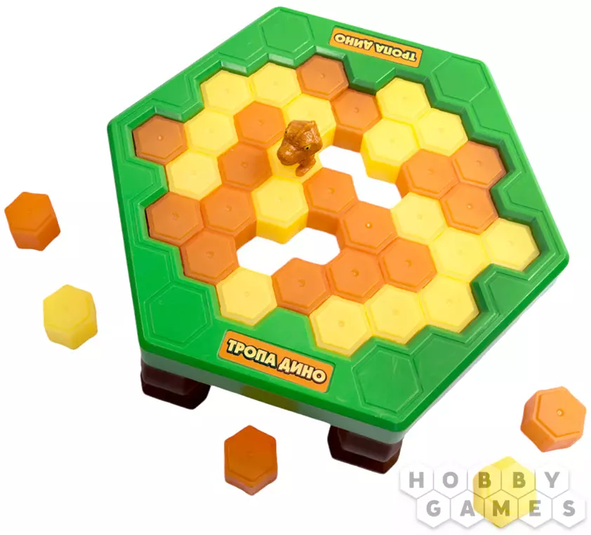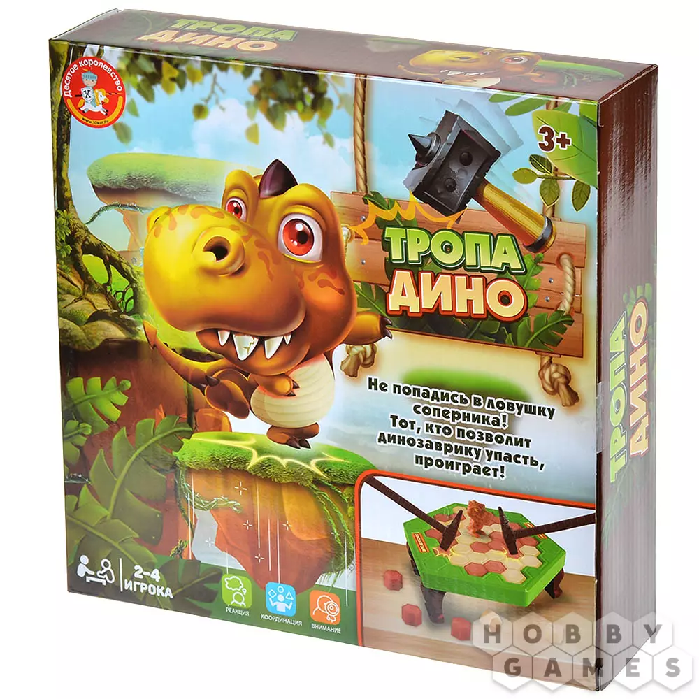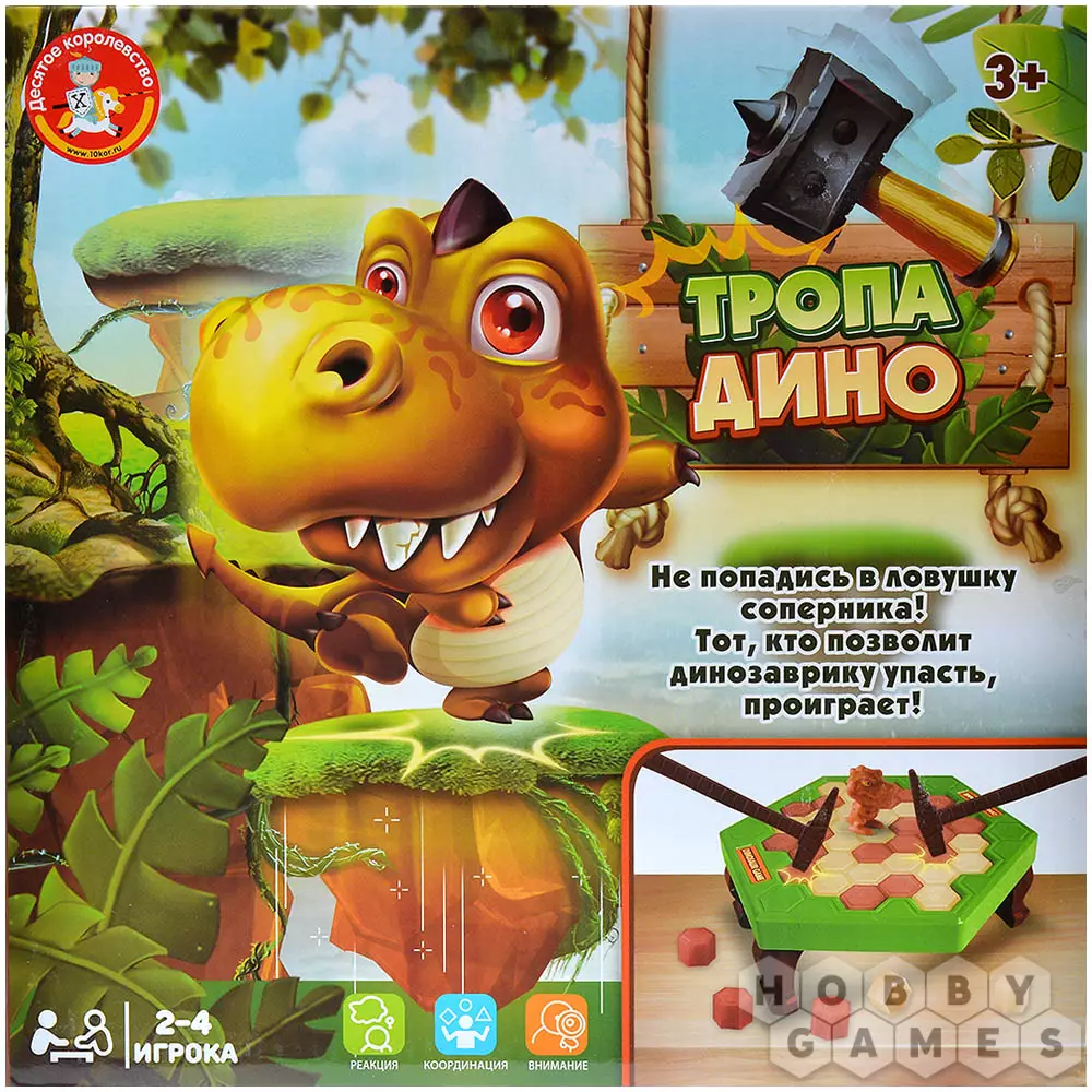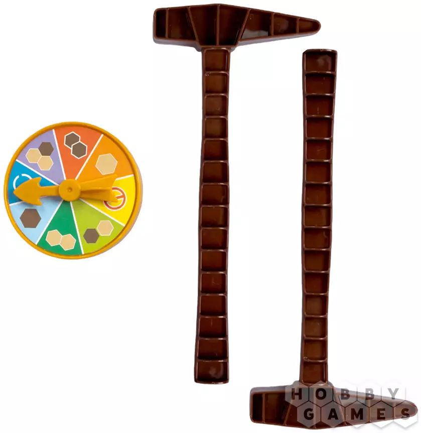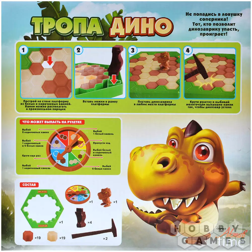 Соберите игровой стол и установите в него полотно из белых и коричневых камешков. Водрузите поверх фигурку динозавра. Теперь ваша задача – по очереди крутить рулетку и с помощью молоточка выбивать то количество и цвет камней, которые вам выпадут. Будьте осторожны: если от вашего неосторожного движения динозаврик упадёт, вы тут же проиграете!