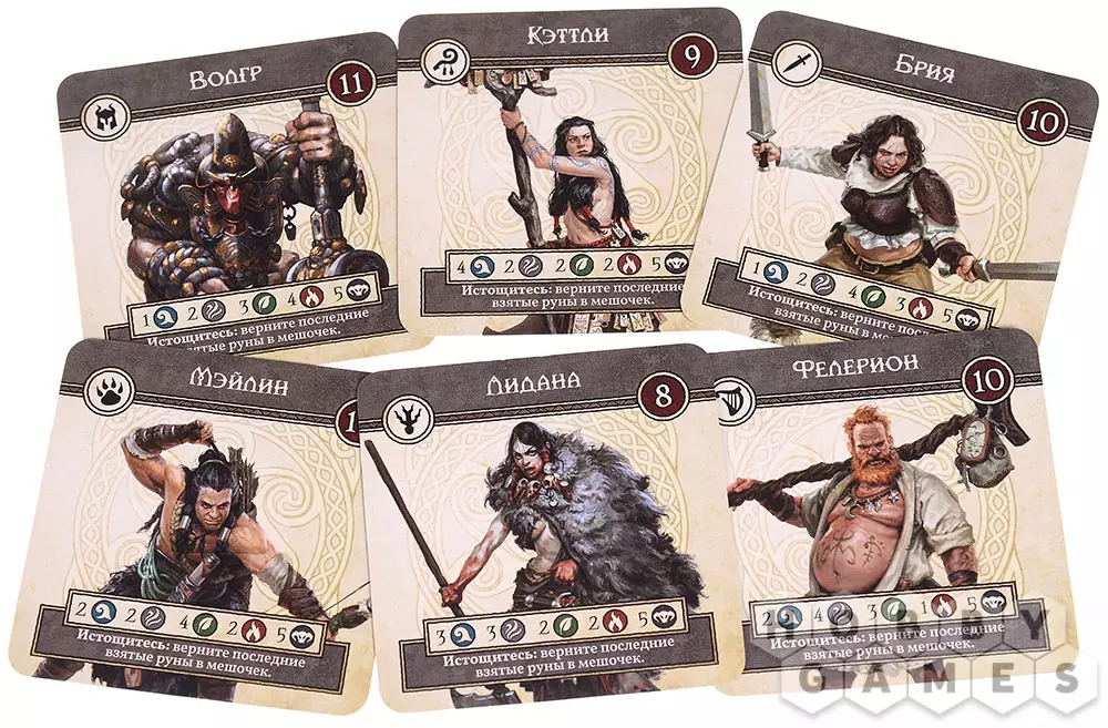 В первую фазу каждый герой может отправиться в соседние земли, чтобы исследовать их. Тут надо быть осторожным: если в покидаемом регионе есть враги, не относящиеся к ориентиру, они наносят герою по одному урону. Куда отправиться? Это вам будет подсказывать книга саг. А каким маршрутом добираться до конечной точки, решать уже вам: пойдёте ли вы из Эйдленда в Дикоземье напрямик сквозь Ледяную гряду, или решите обогнуть горы на корабле через Мрачное море?