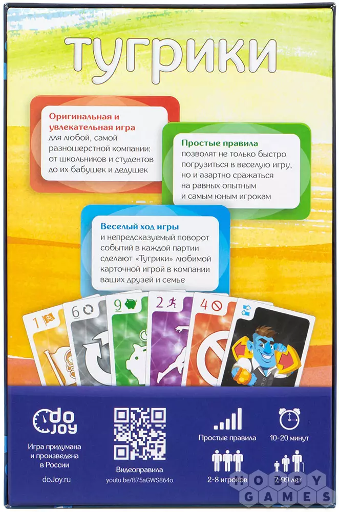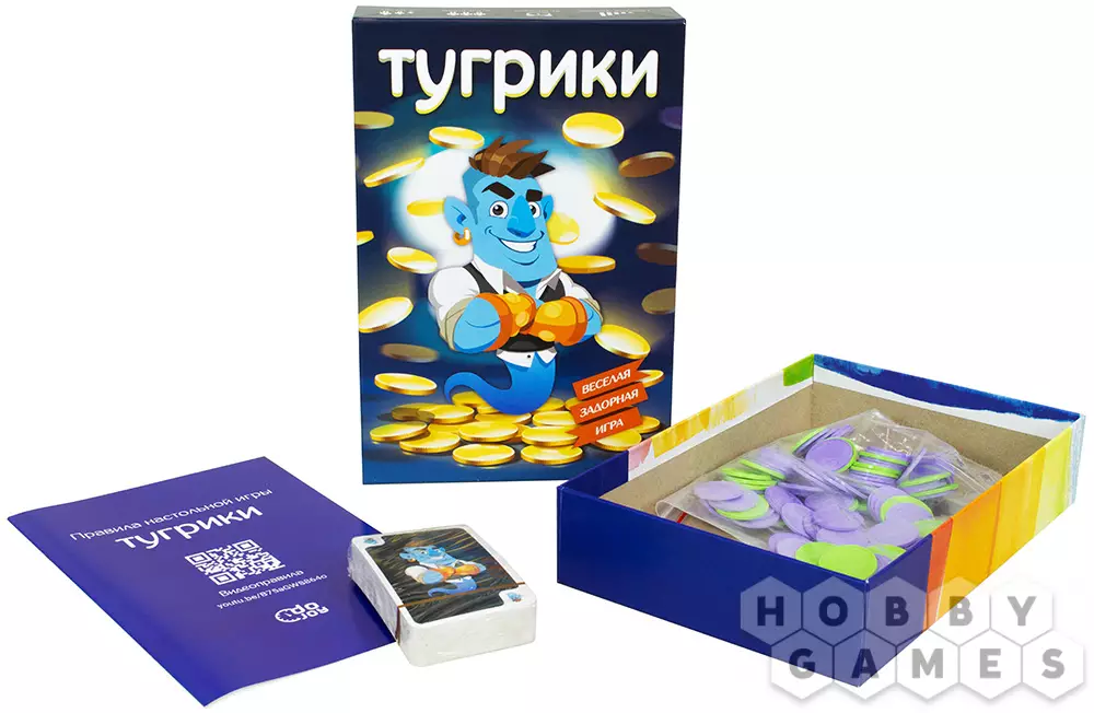 "Тугрики" – увлекательная карточная игра для компании от двух до восьми игроков. Простые правила и очень весёлый и непредсказуемый игровой процесс с лёгкостью сделают “Тугрики” любимой забавой в компании ваших друзей. Успех в игре определяется не набранными очками, а при помощи игровой валюты – тугриков. Вам будет необходимо выстраивать ряды карт согласно их цвету и номиналу. Цель каждого из игроков – первым остаться без единой карты на руках.