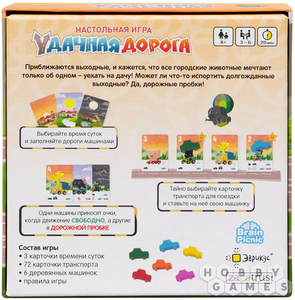 В настольной игре "Удачная дорога" игрокам предстоит доехать до пригорода, а после – вернуться обратно. Причём желательно сделать это, сохранив отличное настроение и собрав по пути как можно больше победных очков. Отправиться в поездку можно утром, днём или ночью. В зависимости от выбранного времени суток будет меняться трафик на дороге, а также количество очков радости, которые, собственно, и являются победными. Путешествуя на протяжении трёх раундов на дачу и обратно в город, участники набирают победные очки. Тот, кто сможет набрать наибольшее количество очков радости, объявляется победителем и самым продуманным додачидобирателем.
