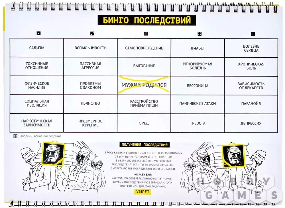 Роли между игроками распределяются следующим образом: кто-то один берёт на себя ответственную задачу быть, собственно, мужиком, а все остальные становятся деструктивными механизмами – агрессией, подавлением эмоций и иными. Цель первого игрока – не умереть, цель всех остальных – погубить несчастного человека и подчинить своей воле, разрушив его жизнь. Каждый ход Назначенный Мужиком передвигает свою фишку по карте жизненных ситуаций, в которых оказывается его персонаж, кидает кубик и изо всех сил старается противостоять мерзким голосочкам токсичной маскулинности. В зависимости от результата броска и его готовности принимать волевые решения мужик либо переживает проблему малой кровью, либо получает первую травму, которая обязательно аукнется ему в будущем. Пять таких последствий, расположенных в ряд на поле последствий, – и мужик отправляется в мир иной, а деструктивные механизмы ликуют: туда ему и дорожка!