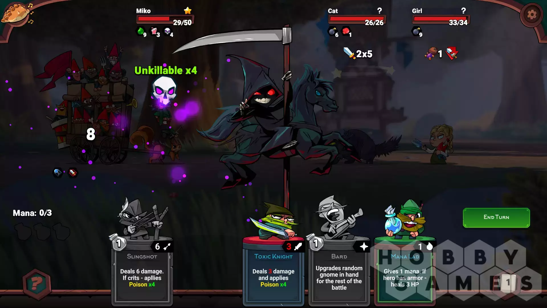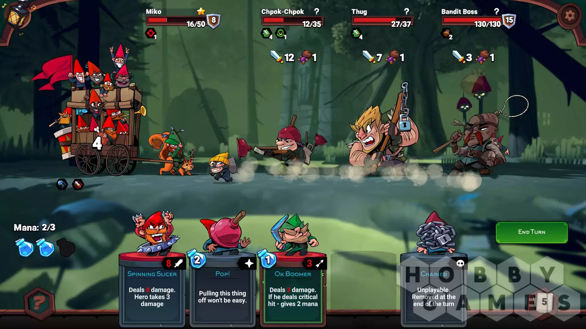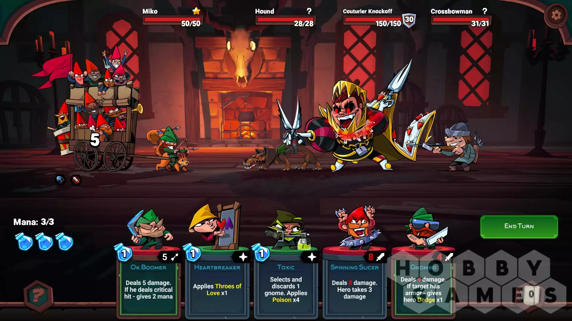 Чтобы уничтожить работорговцев, выберите одного из трех отважных героев-гномов с уникальными чертами, колодами и особыми способностями. Улучшайте гномов между партиями, чтобы повысить эффективность отряда.
