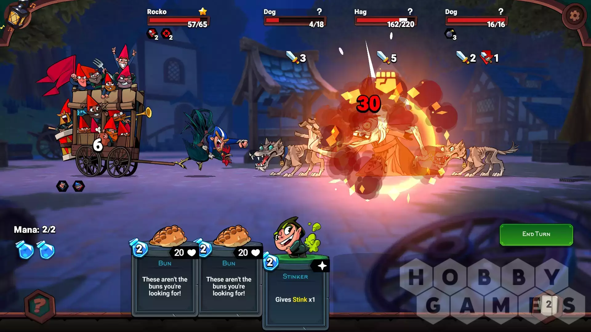 3 героя-гнома, 130 карт для колоды и 24 разных эффекта, которые можно швырять в лицо врагам и гномам.